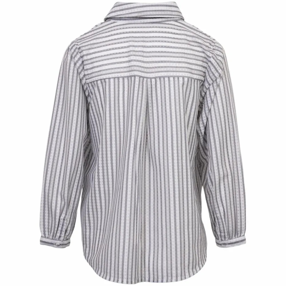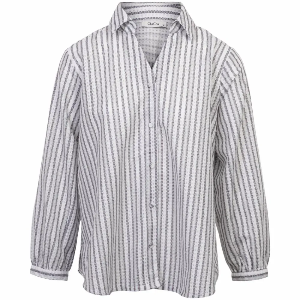 Cha Cha dame skjorte. Skjorten har gennemgående knappelukning, samt knappe i ærmerne. Den flotte stribede skjorte er designet i et let og luftigt hulmønster.