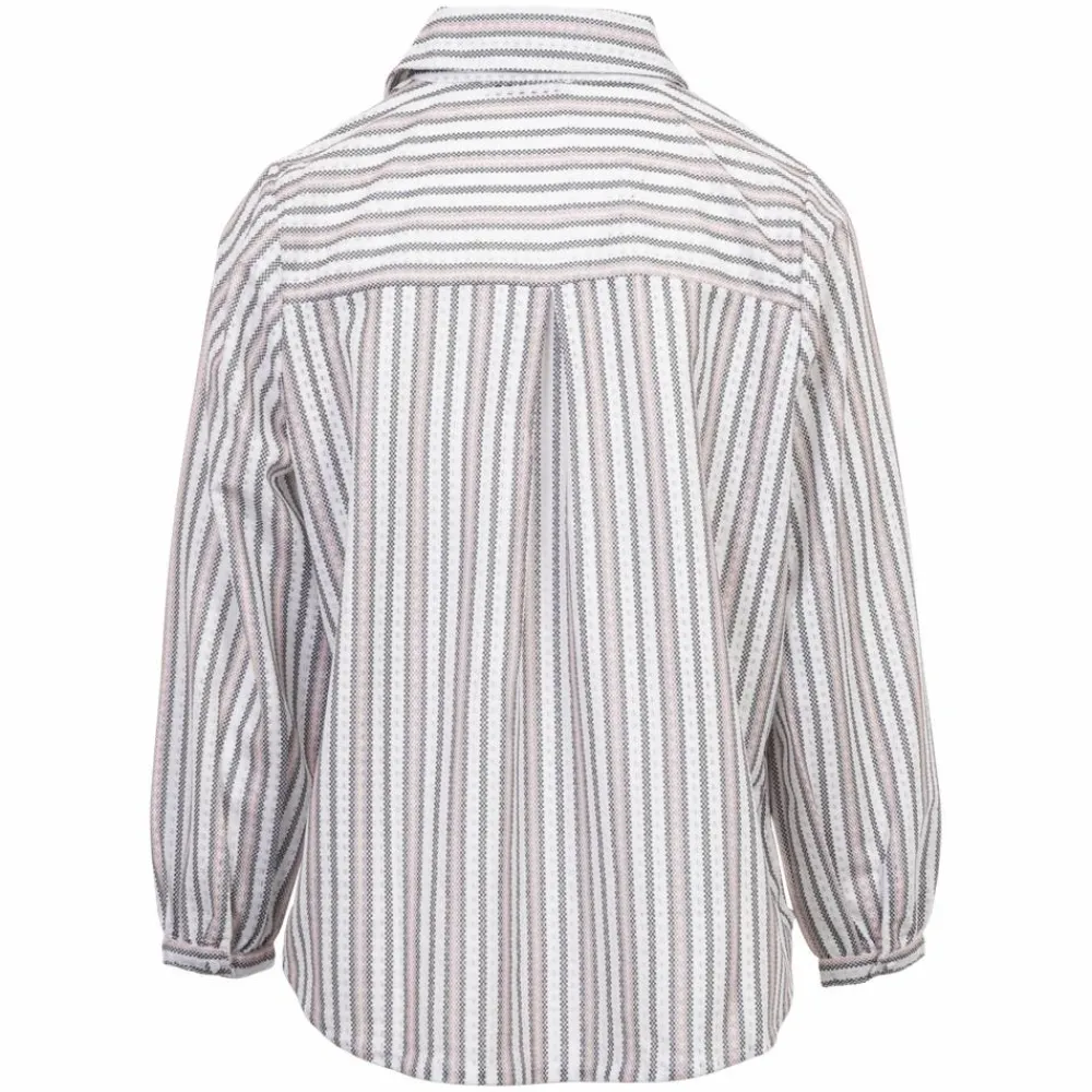 Cha Cha dame skjorte. Skjorten har gennemgående knappelukning, samt knappe i ærmerne. Den flotte stribede skjorte er designet i et let og luftigt hulmønster.