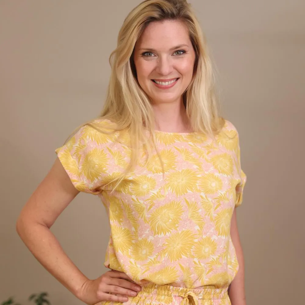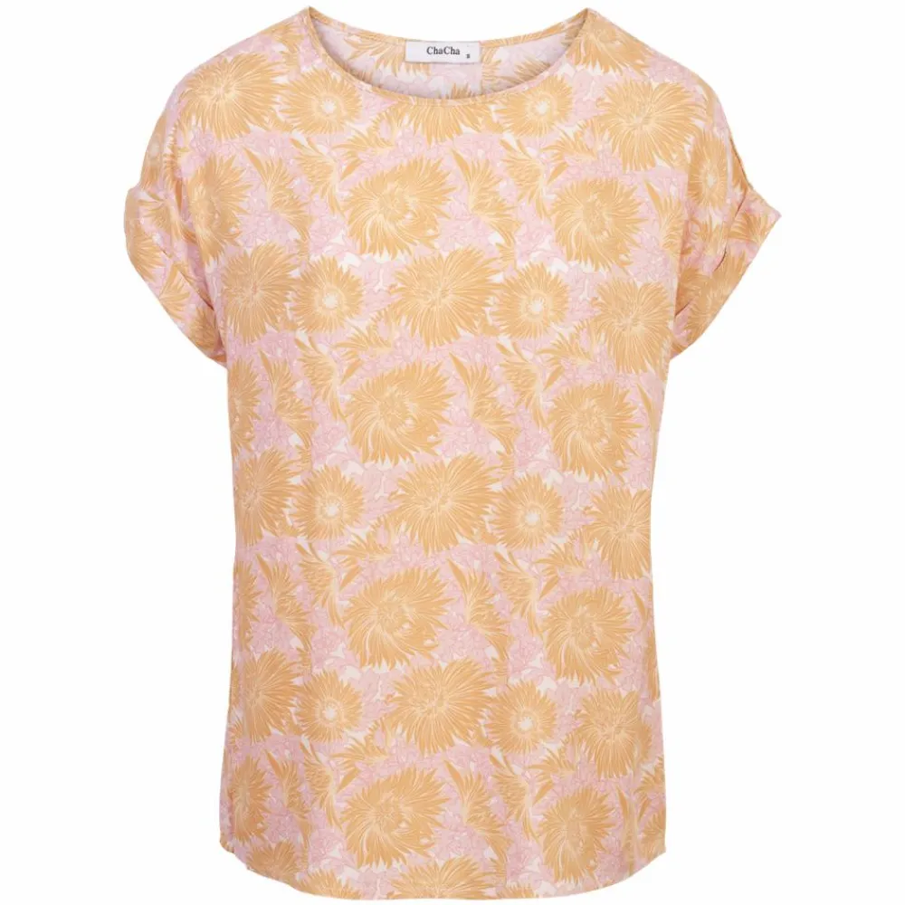 ChaCha Dara dame t-shirt. Super smart t-shirt til kvinder, med flot all-over print. Modellen har opsmøring ved ærmerne, samt en rund halsudskæring.