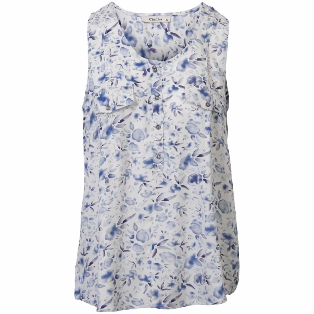 Cha Cha dame top. Smart top med brede stropper. Toppen har pyntelommer på brystet, samt knappelukning ved den runde halsudskæring.