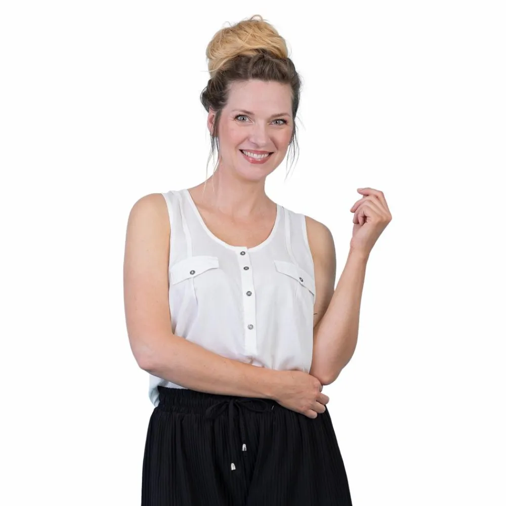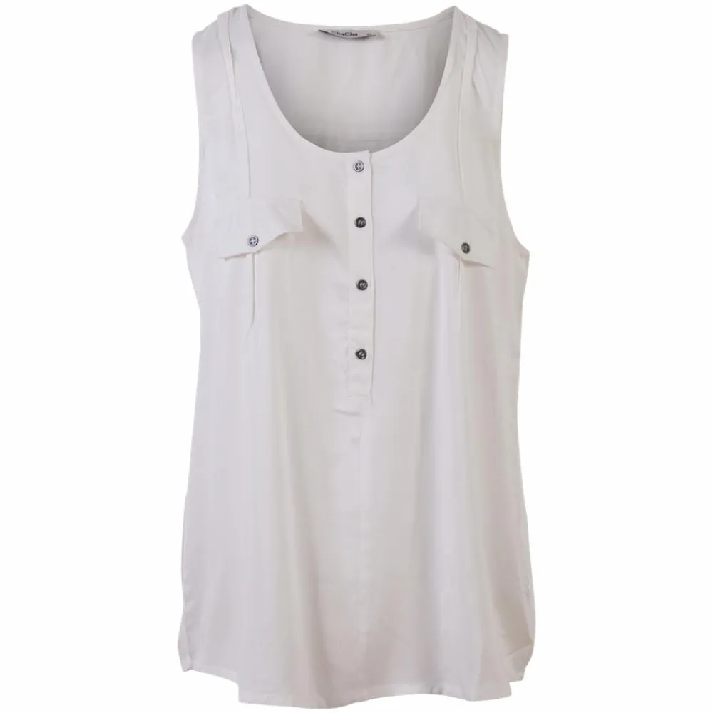 Cha Cha dame top. Smart top med brede stropper. Toppen har pyntelommer på brystet, samt knappelukning ved den runde halsudskæring.