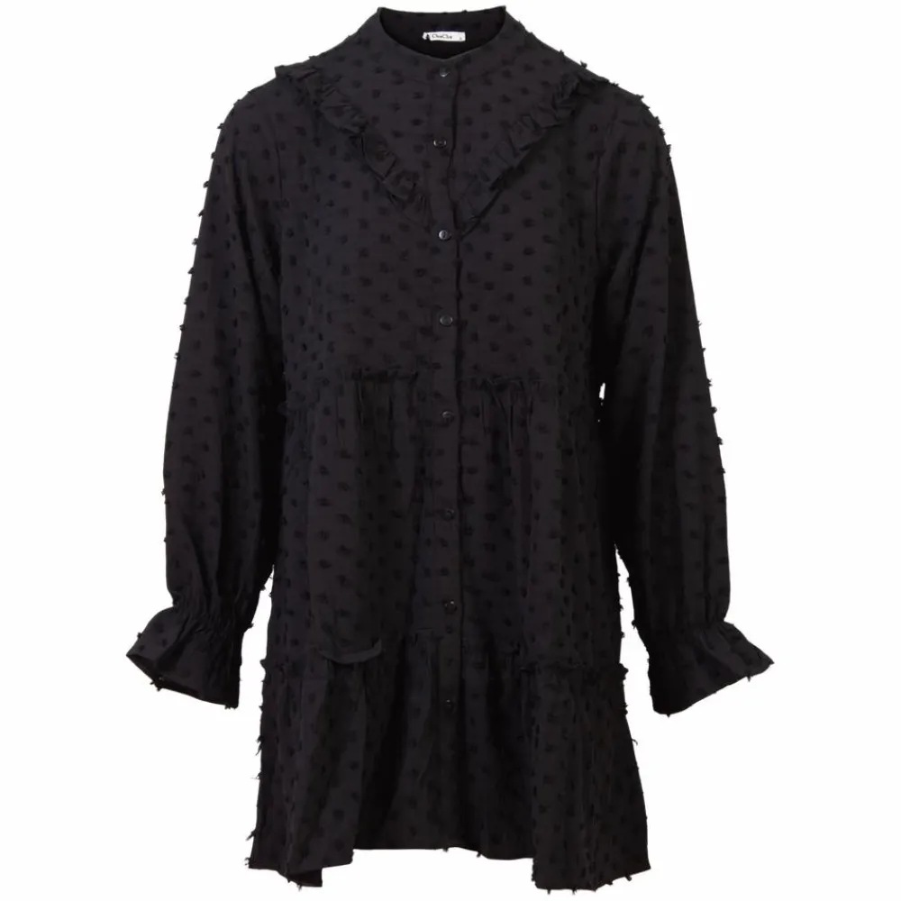 ChaCha dame tunika. Flot og feminin tunika med rund halsudskæring. Tunikaen har gennemgående knaplukning, lange ærmer og vidde. Yderligere har tunikaen læg, som giver en flot og feminin pasform.