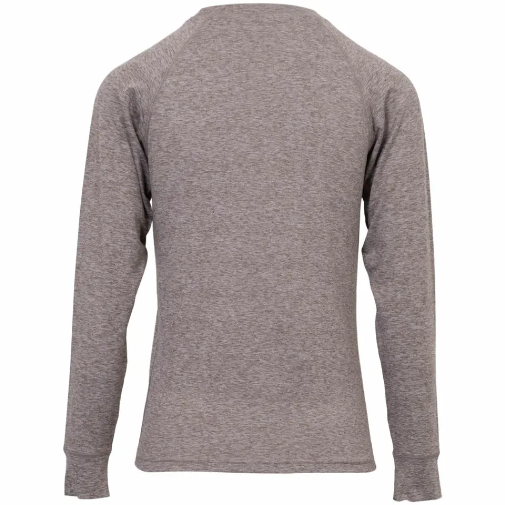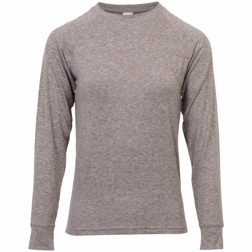 En tæt, blød trøje i beige melange, der lægger sig let mod kroppen og holder på varmen uden at fylde. Den runde hals og raglanærmer giver et naturligt fit under jakker og mellemlag, så du kan holde fokus på turen, ikke tøjet.
