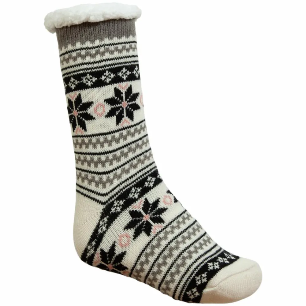 Bløde dame strømper med julemotiv. Strømperne har skridsikker gummi dutter under bunden og et langt skaft op ad benet.