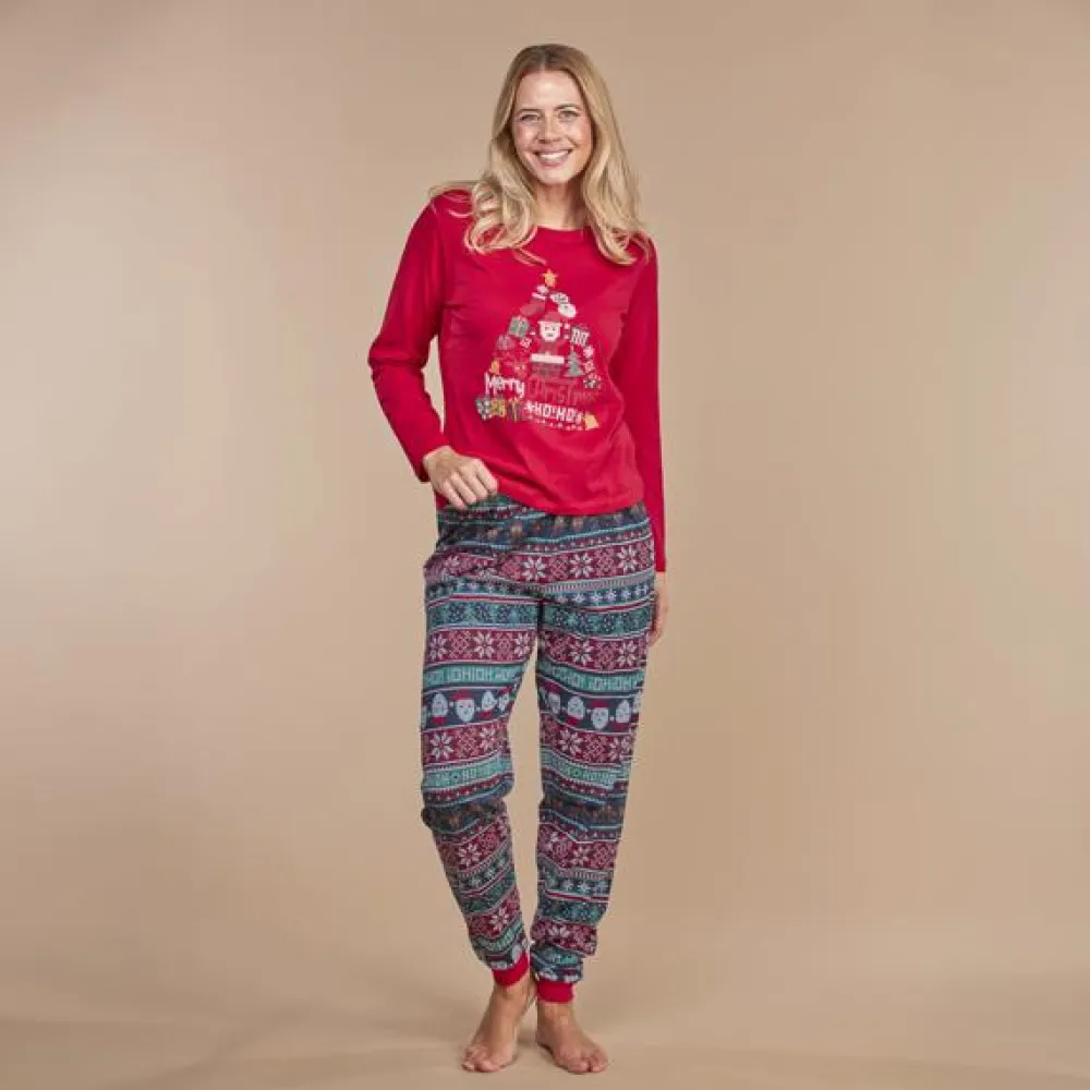 Crossbow dame julepyjamas. Todelt nattøjssæt med juleprint. Bukserne har elastikkant i taljen og ribkant ved anklen. Blusen har lange ærmer og rund halsudskæring.