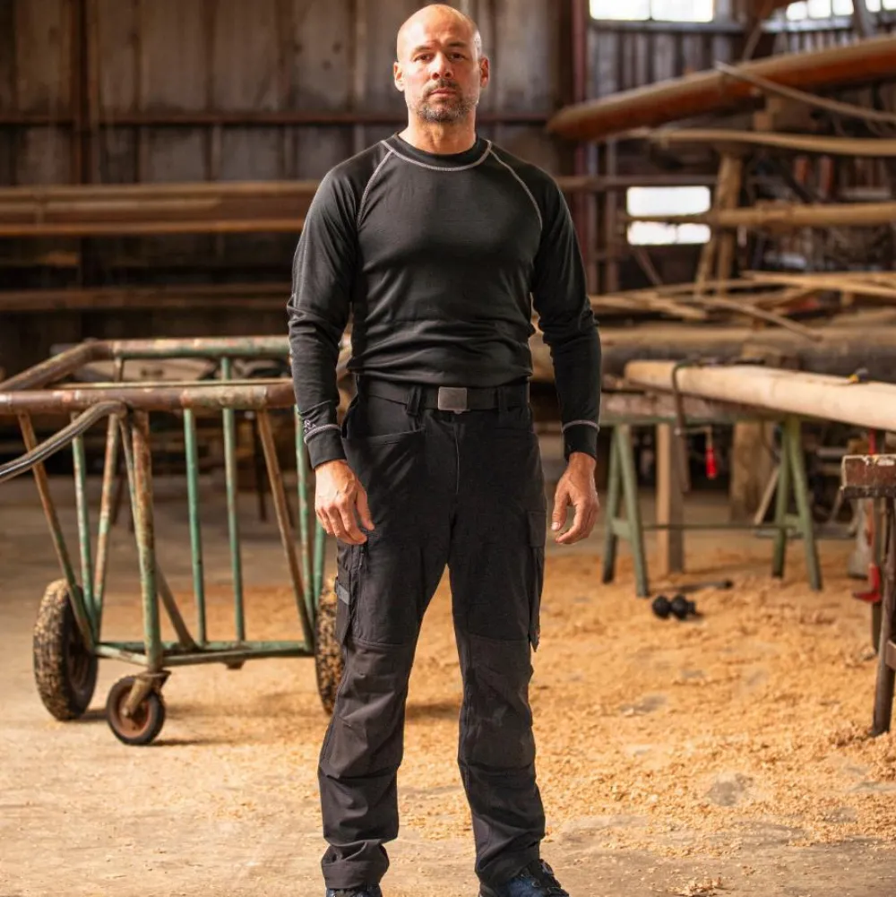 Elka arbejdsbukser i vandafvisende materiale. Arbejdsbukserne har en vertikal lomme med reversed lynlås, Cordura® forstærket tommestok lomme, Cordura® forstærket knælomme, 2 baglommer i Cordura® forstærkning bagpå samt to frontlommer. Benlængden kan forlænges med 4 cm.