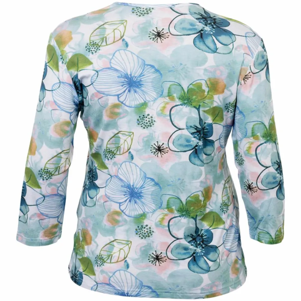 Gabriella K. plus size t-shirt med all over print. T-shirten har en klassisk rund hals og korte ærmer. Blusen er dekoreret med blomsterformede mønstre med påsatte rhinsten.