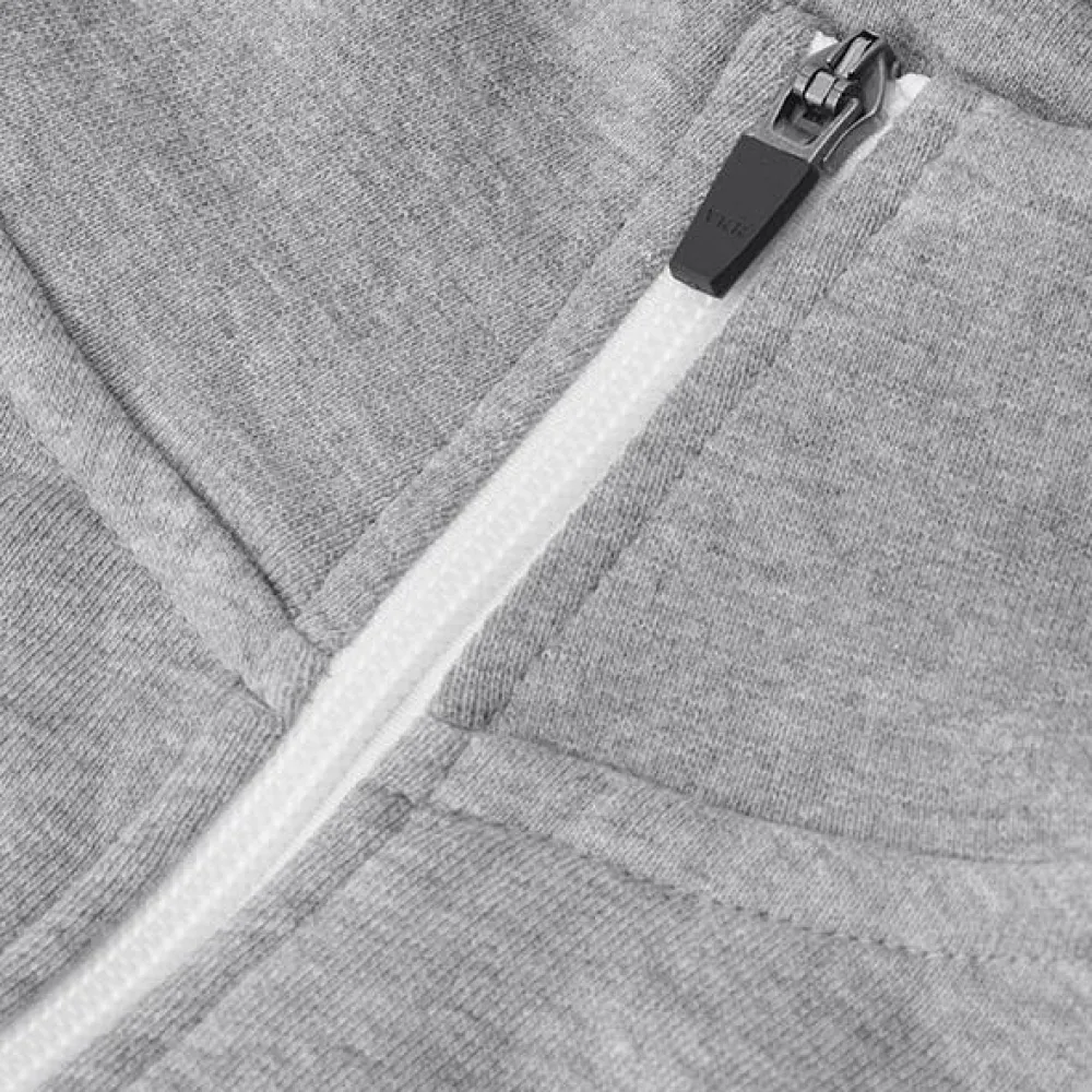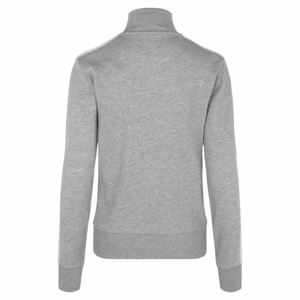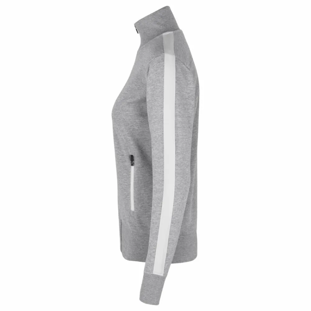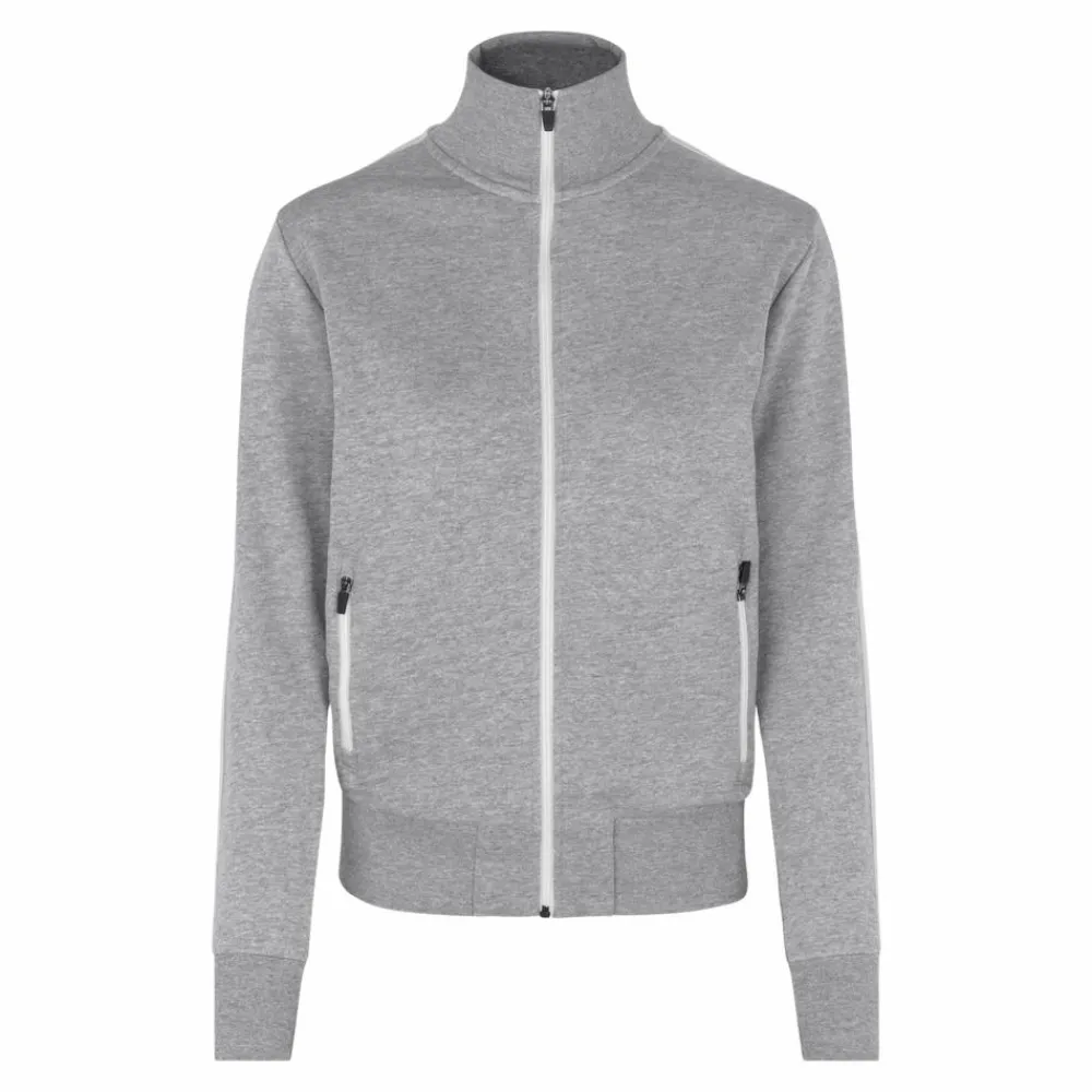 Sporty damecardigan i kraftig kvalitet. Hvid kontraststrib på ærme. Gennemgående lynlås og to sidelommer med lynlås i hvid. Nakkebånd, nakkespejl og rib ved ærme og bund. Ubørstet inderside.