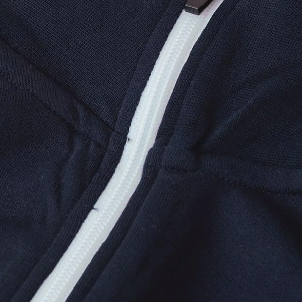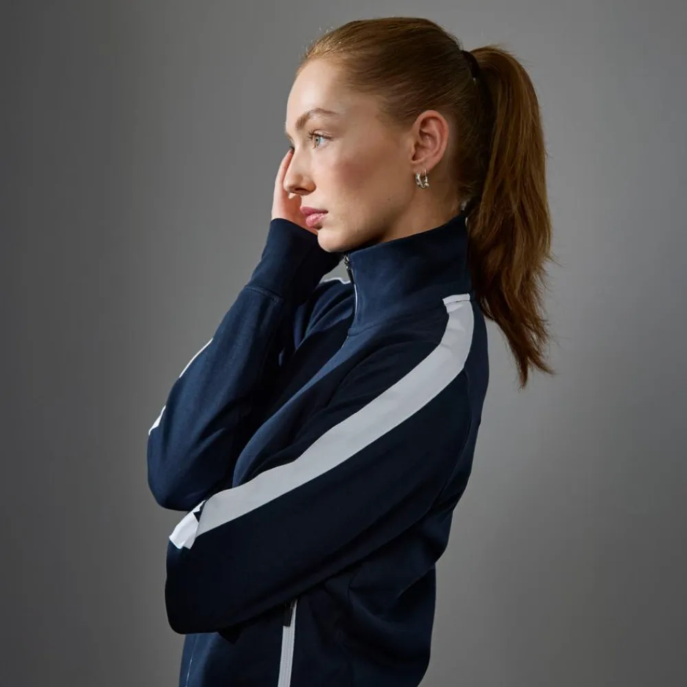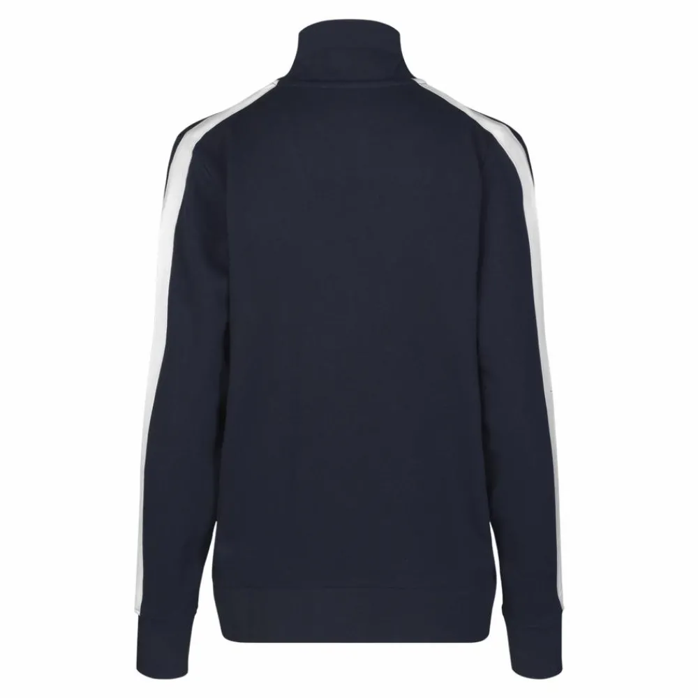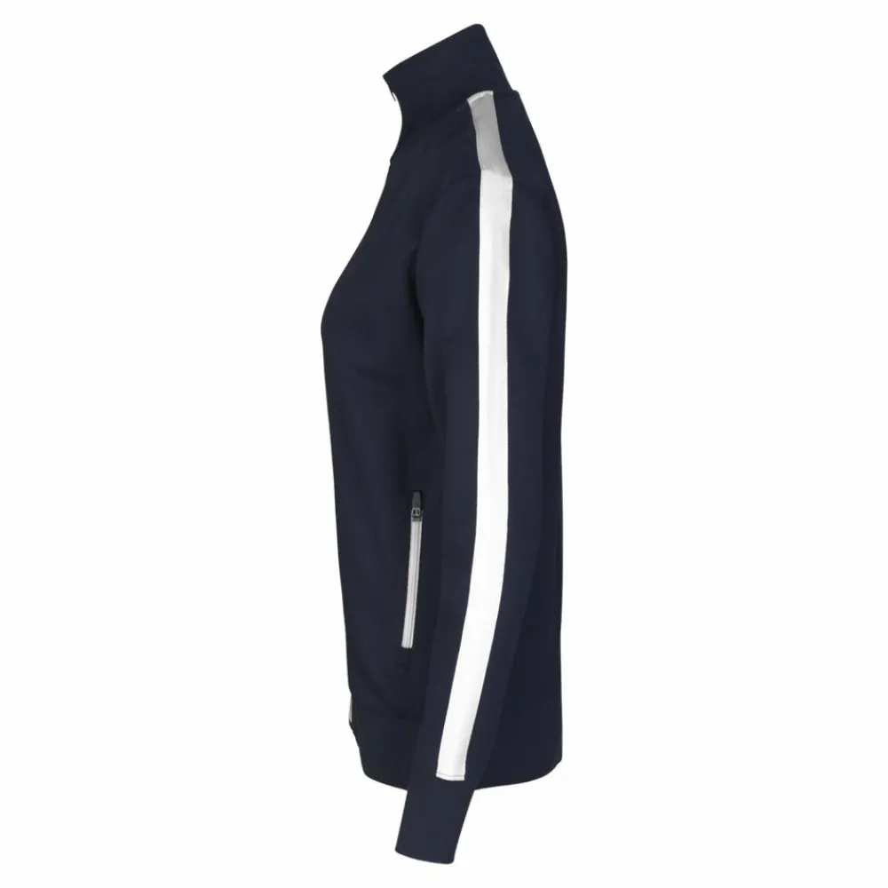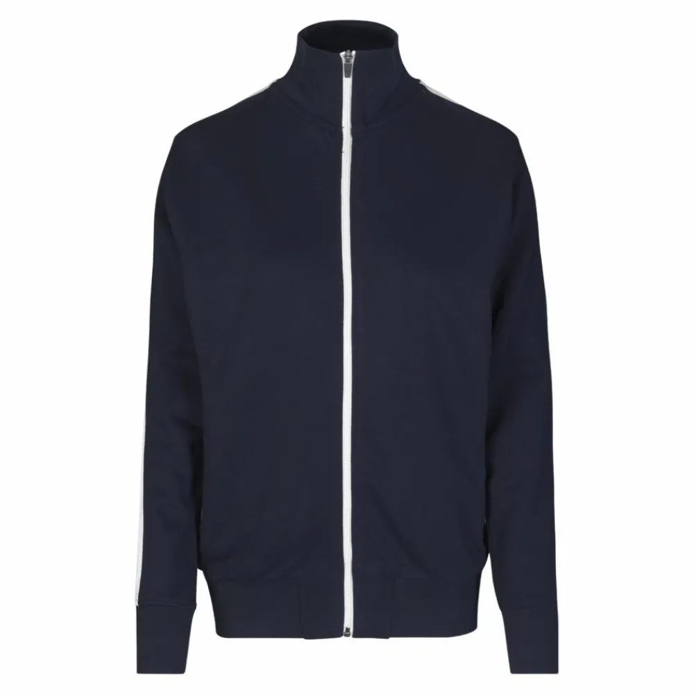 Sporty damecardigan i kraftig kvalitet. Hvid kontraststrib på ærme. Gennemgående lynlås og to sidelommer med lynlås i hvid. Nakkebånd, nakkespejl og rib ved ærme og bund. Ubørstet inderside.
