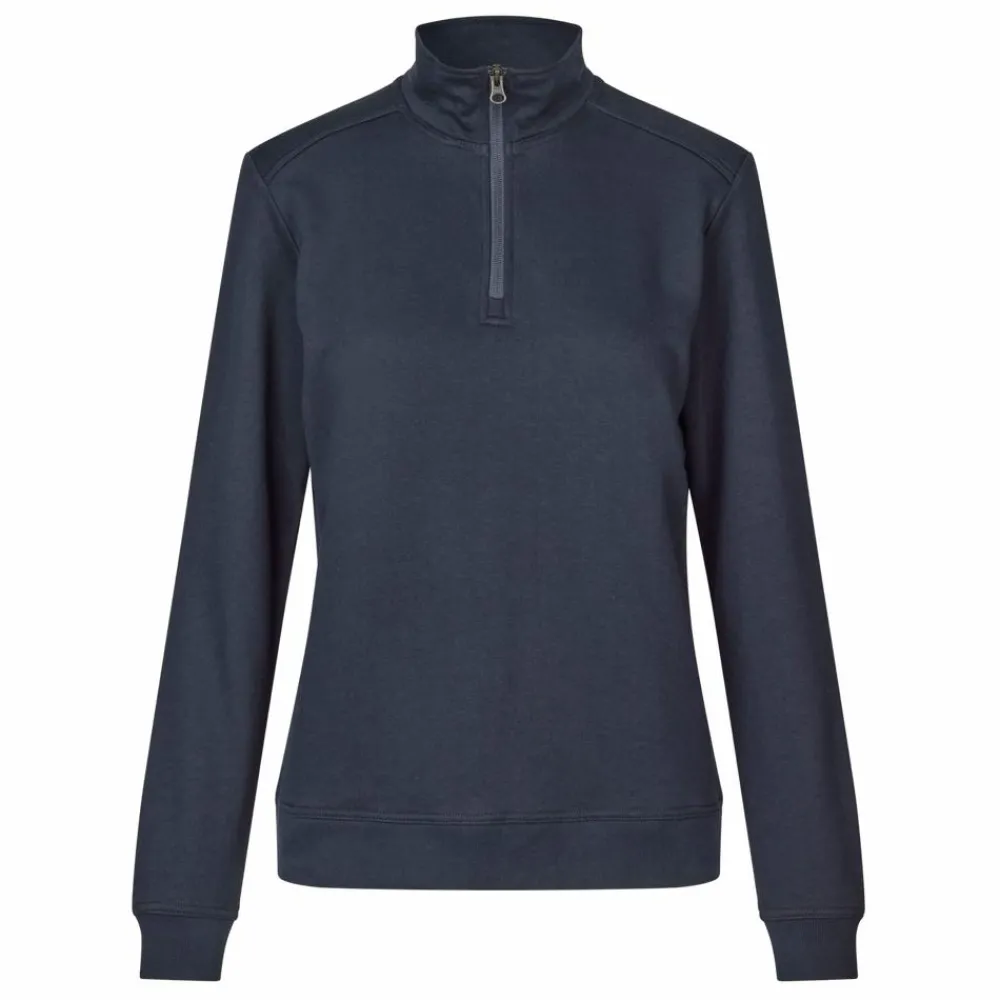 EU-blomst certificeret, slidstærk 1/4 zip sweat med ubørstet inderside. Ekstra forstærkning på skulderstykket, samt forstærkning af nakkesøm. Dobbeltstikning og rib ved ærme og bund. Fremstillet af ansvarligt fremstillet bomuld samt recycled polyester, og har gennemgået en forkrympningsproces ved meget høje temperaturer, både før og efter indfarvning for ekstra stabilitet og lang levetid.