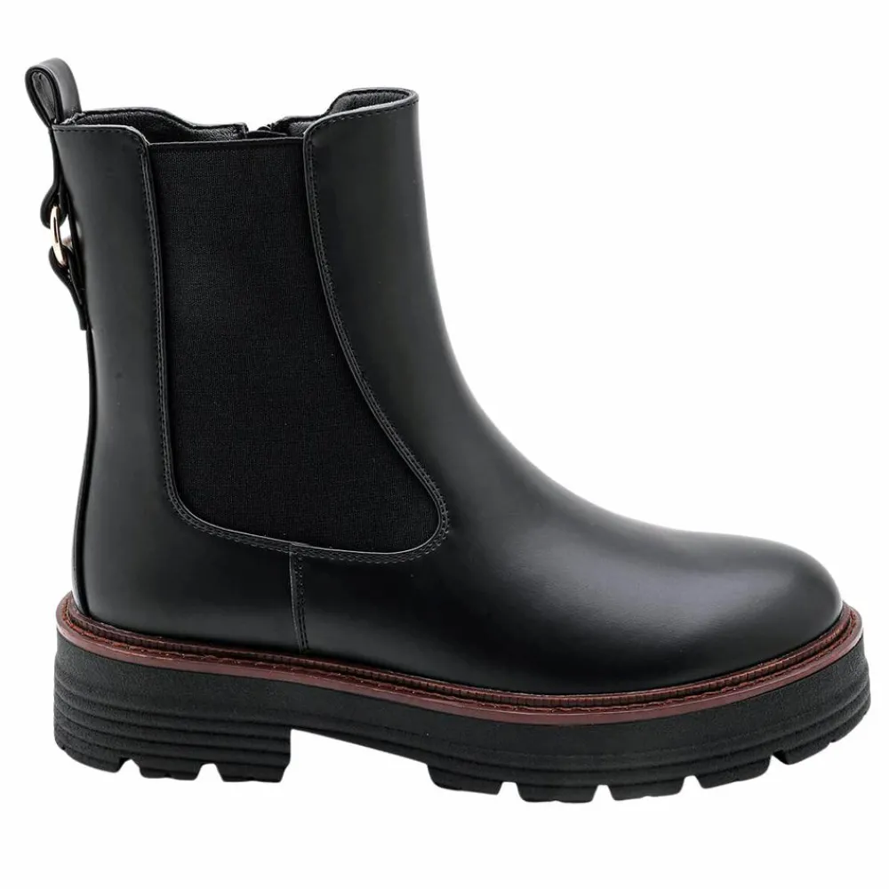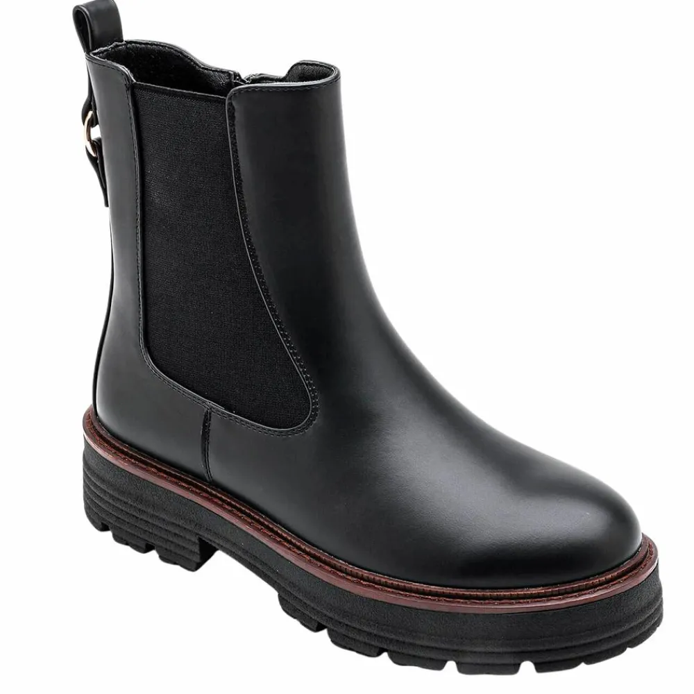 Elegant damestøvle i klassisk og smart design. Støvlen har en let foring og er designet med elastik i den ene side og lynlås i den anden side og med en strop bagpå, som gør støvlen let at tage af og på. Den kraftige slidstærke sål giver et moderne look og sikrer god komfort hele dagen. De flotte støvler har en brun kontrast stribe mellem sål og støvle. Støvlen er velegnet til både hverdag, fritid og festlige lejligheder. Støvlen er stilren og enkel og let at style til alt fra jeans og leggings til kjoler og nederdele.