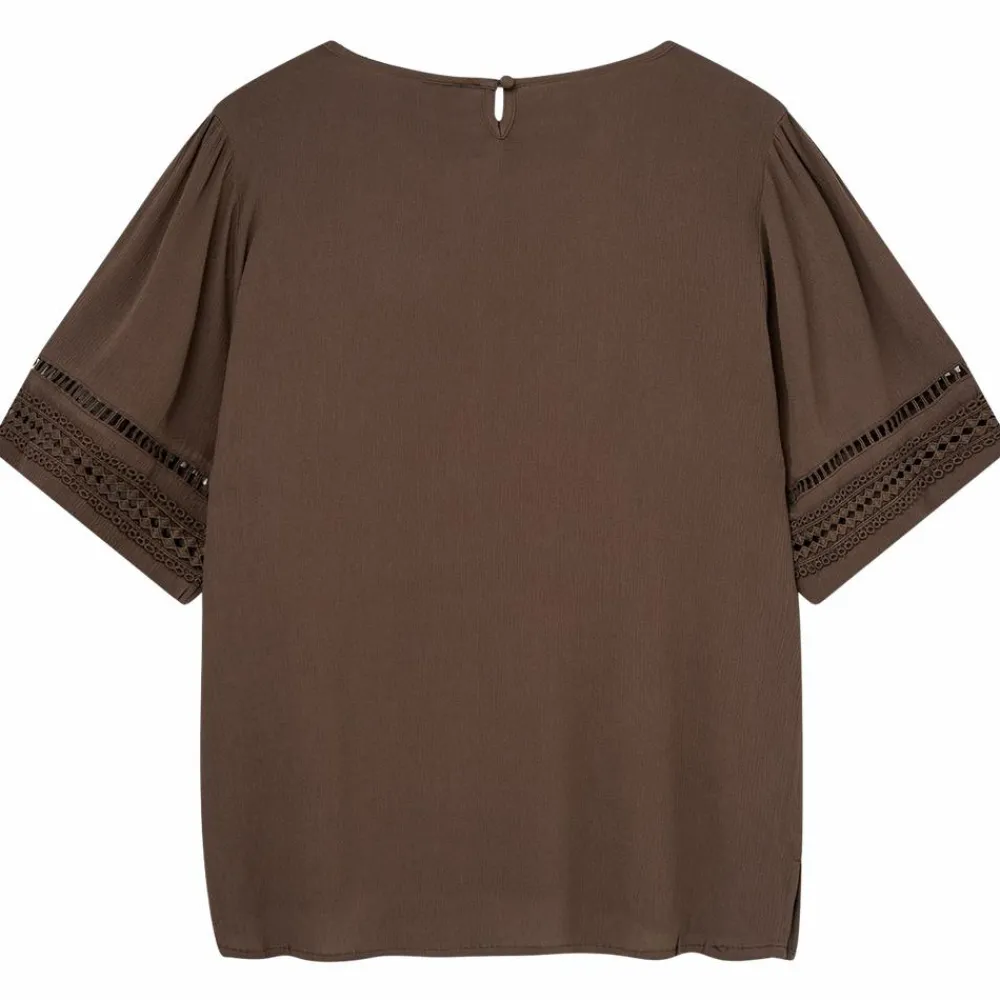 Behagelig og luftig bluse med et fint hulmønster på ærmet. Der er en enkel knaplukning i nakken.