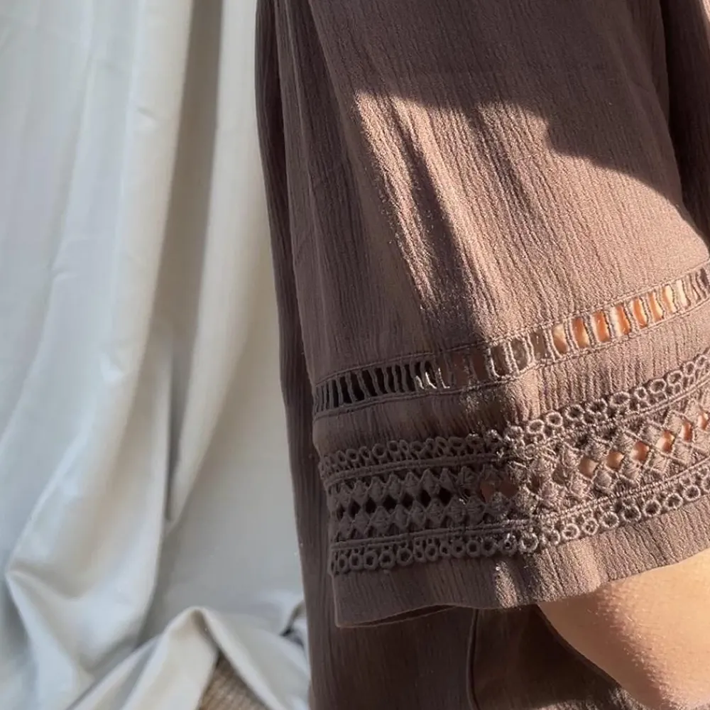 Tunika med rund halsudskæring og korte ærmer med fint hulmønster. Tunikaen har lille stolpelukning med knapper foran. Det fine hulmønster går igen nederst på tunikaen.