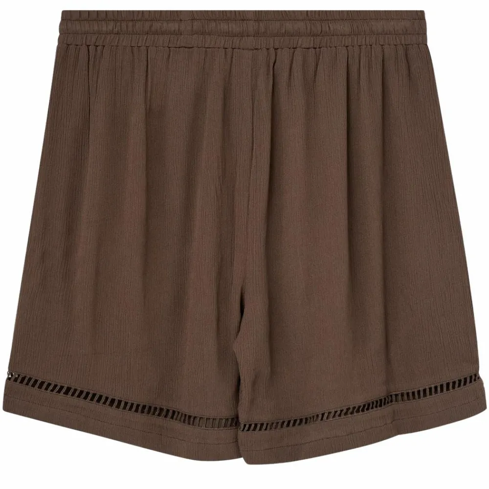 Lette og behagelige shorts fra Kopenhaken. Shorts med skrålommer, bindebånd og elastik i linningen, og et fint hulmønster forneden.