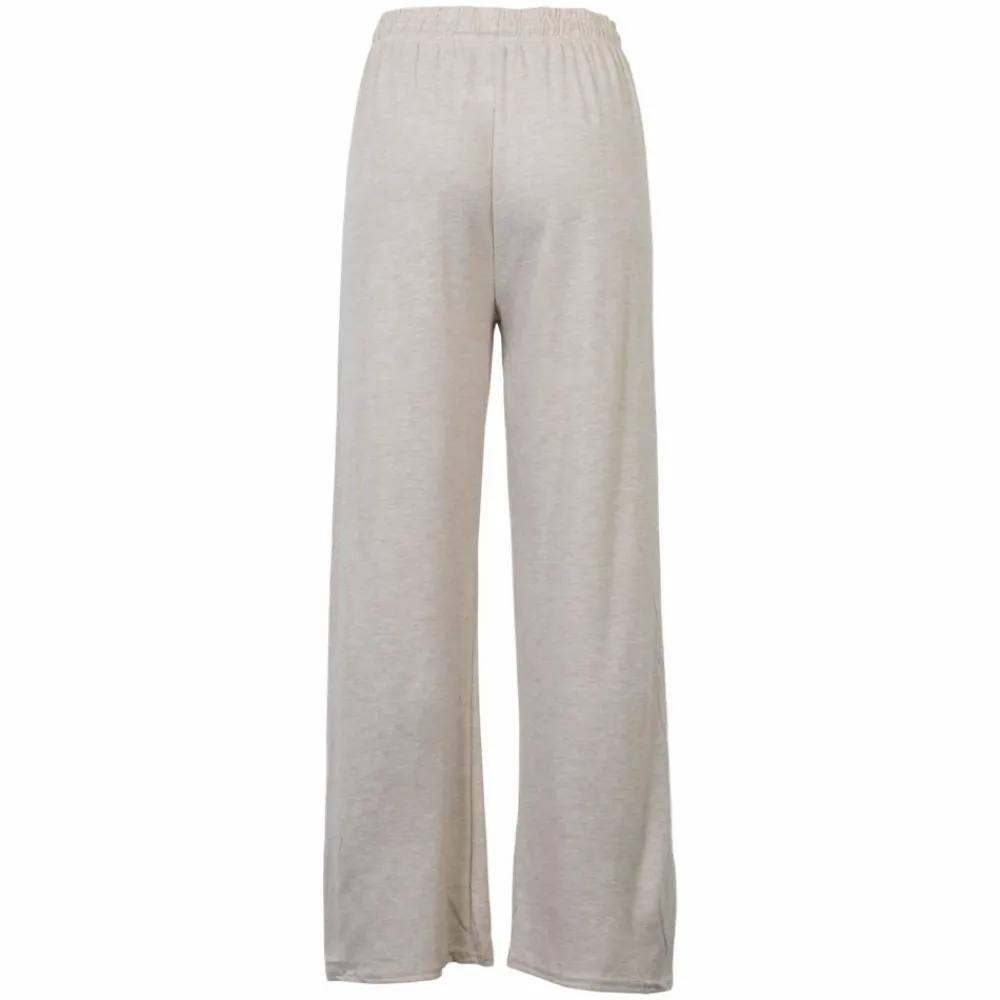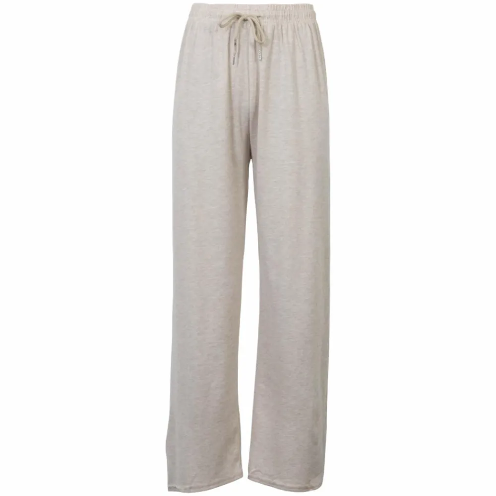 Den afslappede silhuet med bredt ben giver luft og bevægelse gennem hele dagen. Den lyse melange i beige skaber et roligt udtryk, mens den elastiske talje med justerbar snøre og små metalender sikrer en behagelig, personlig pasform. Det rene design uden lommer lader stoffet falde pænt og føles blødt mod huden.