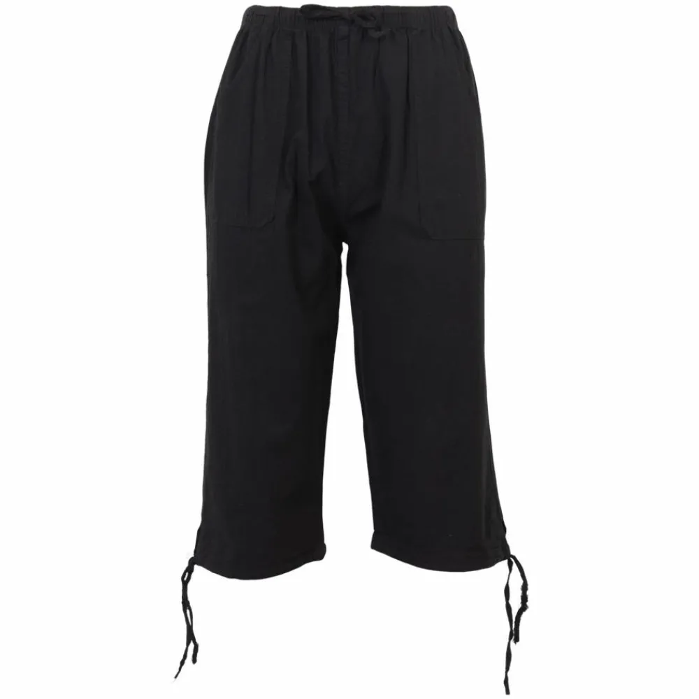 Flotte og klassiske dame capri bukser. Bukserne er fremstillet i blødt materiale, som føltes behageligt at have på. Capri bukserne har elastik og bindebånd i taljen, som gør det er muligt at justere bukserne, så de sidder helt perfekt. Bukserne har to lommer foran. 3/4 bukserne har justérbar snøre ved buksebenets kant, så bredden kan reguleres.