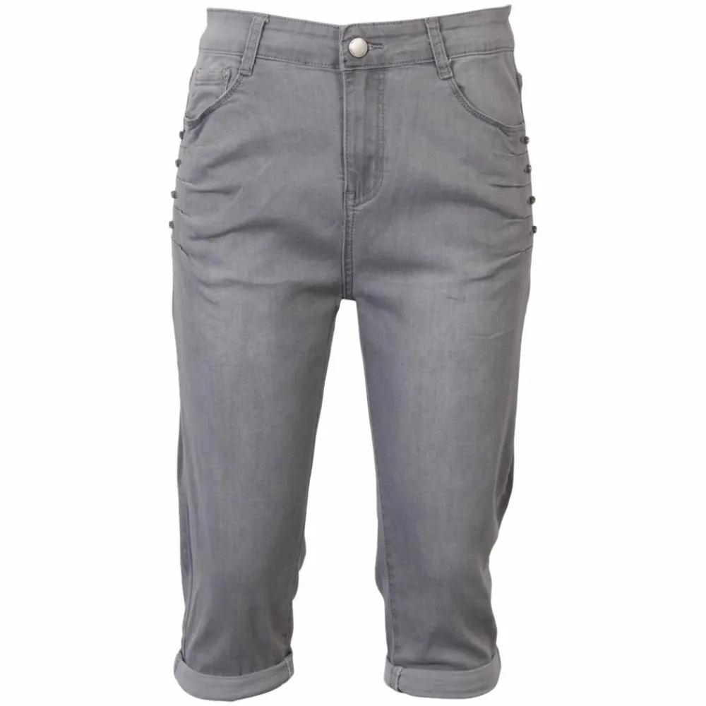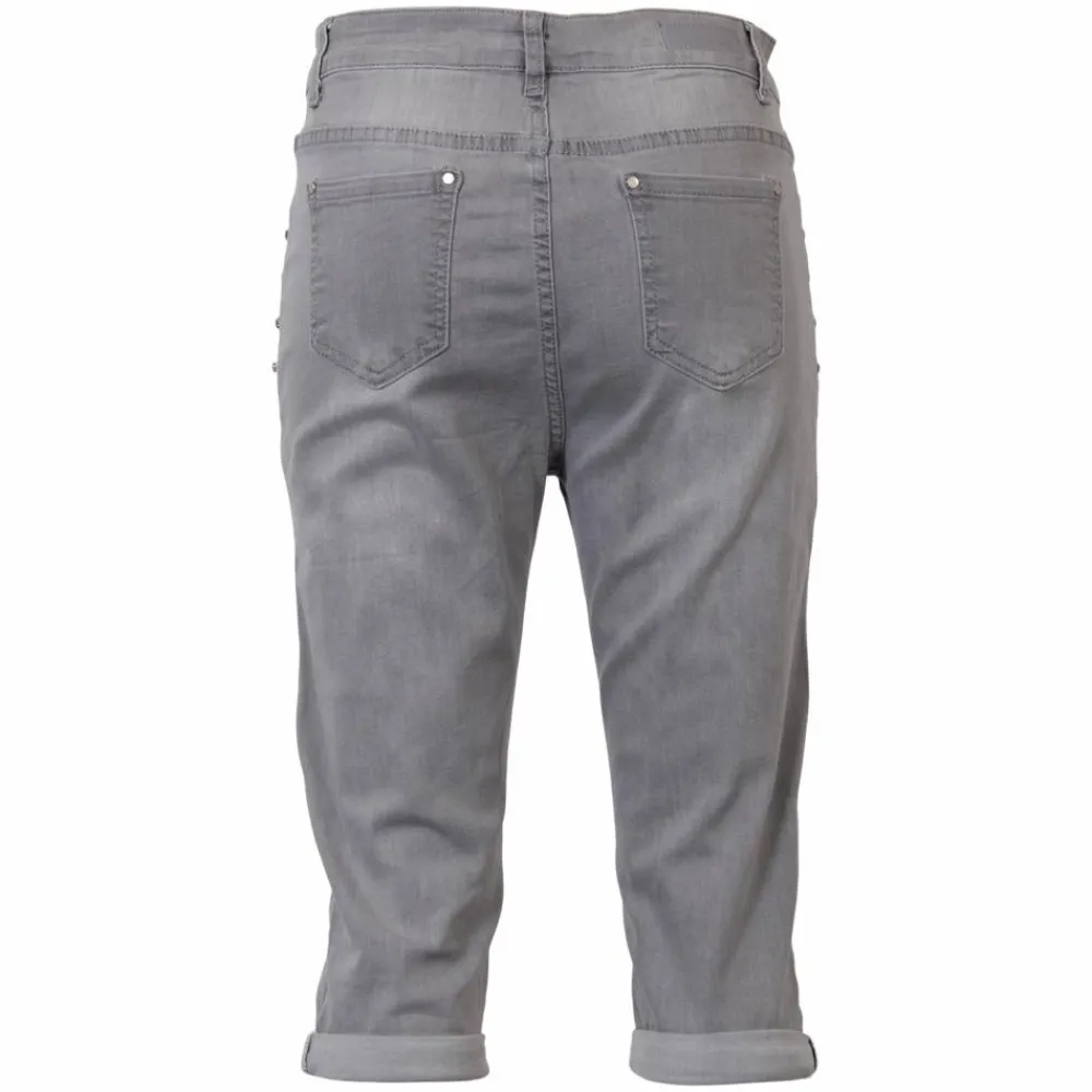 Dame capri bukser i ensfarvet grå. Bukserne har fold i bunden af buksebenene, åbne lommer samt bæltestropper.