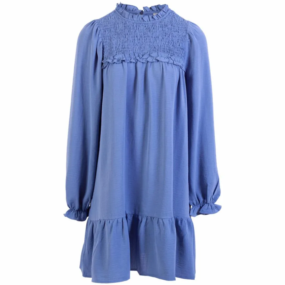 Dame langærmet kjole. Flot langærmet kjole med flæse detaljer, elastik i ærmet samt skæring i bunden. Kjolen lukkes i nakken med en lille knap. OBS! lille i størrelsen.