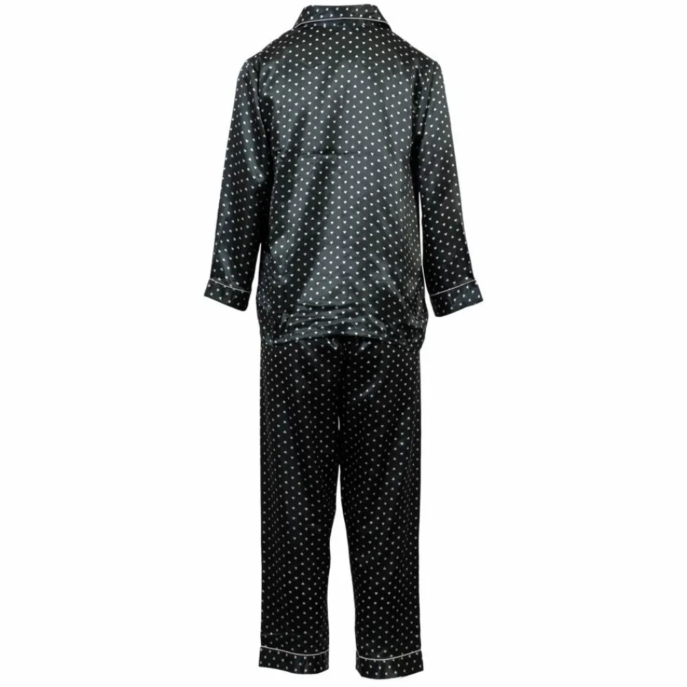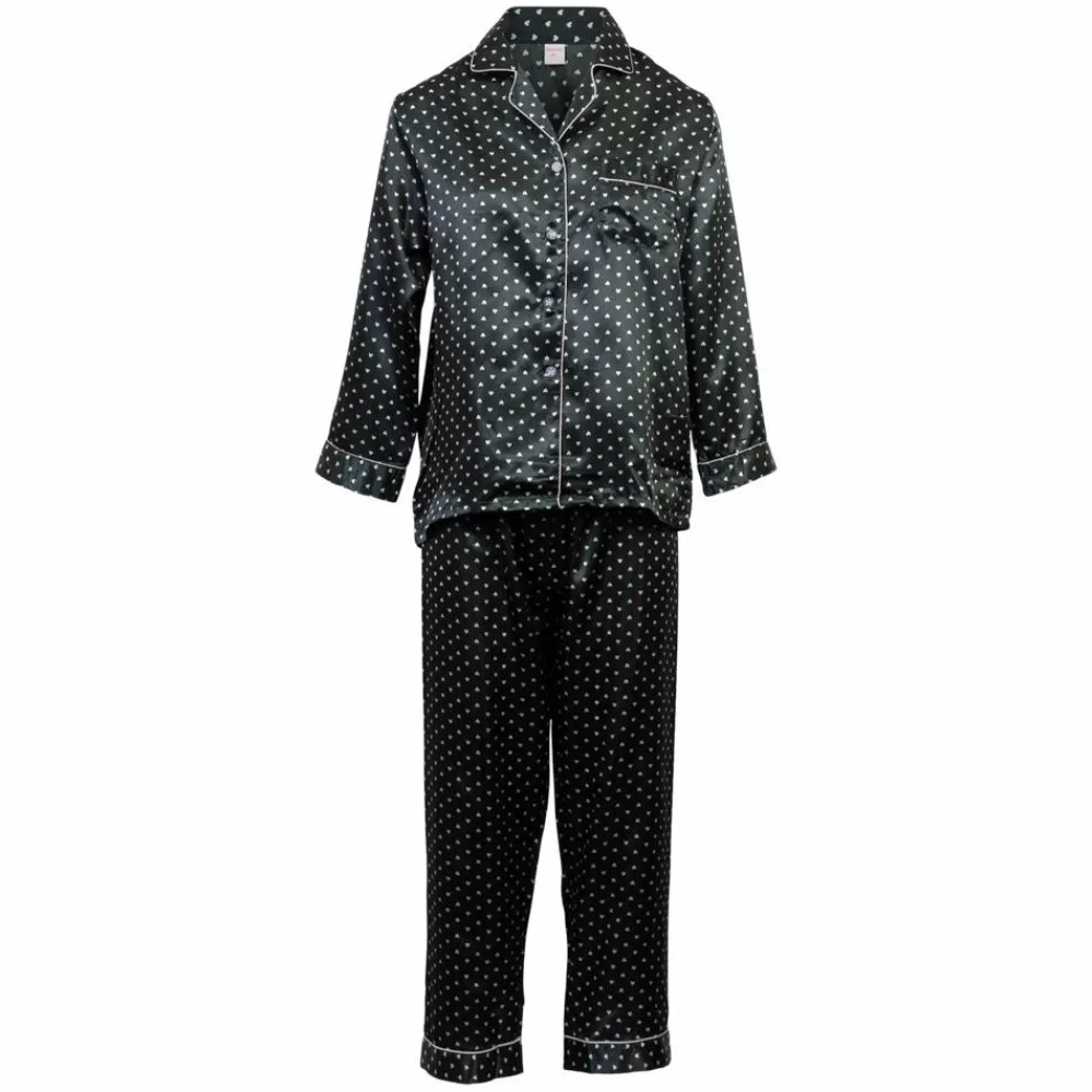 Flot damepyjamas med silke. Dejlig blød todelt pyjamassæt i et fint all-over print med små hvide hjerter. Overdelen har en fin revers hals og gennemgående knappelukning. Blusen har en brystlomme på venstre side. Natbukserne har lige ben og en løs pasform. Bukserne har en smal elastik i taljen, som sikrer at de falder pænt. Her får du et perfekt og behageligt sæt til afslapning eller til at sove i.