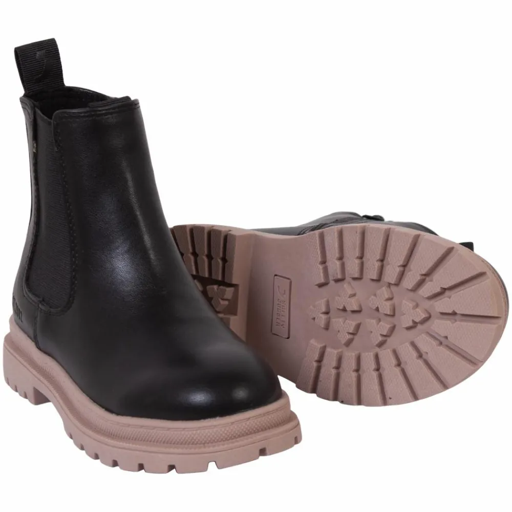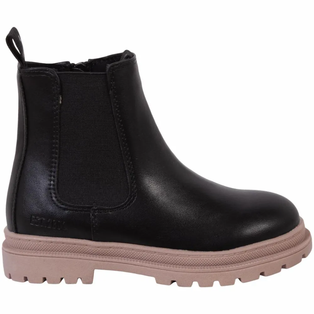 Støvler i sort med elastik på ydersiden af anklen og lynlås på indersiden, som gør at støvlerne tilpasser sig fint til foden. Støvlerne har strop bagpå og foran, som gør dem nemmere at få på.