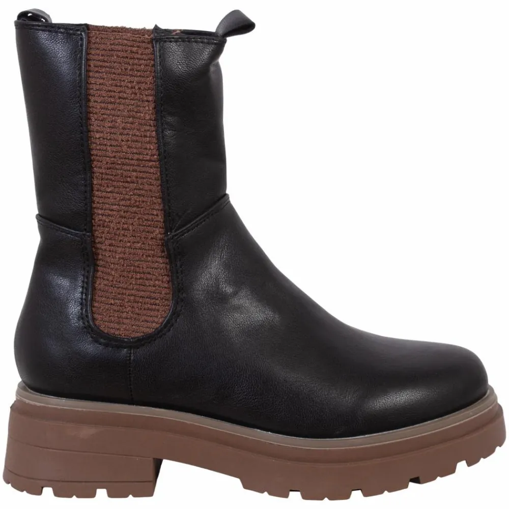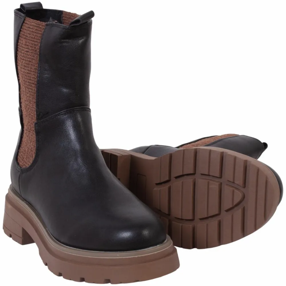 Dame støvle i sort og cognac med elastik om anklerne og langs benet, som gør at skoene tilpasser sig. Støvlerne har en strop bagpå og foran, som gør at de er nemme at tage på. Chunky hæl og sål.