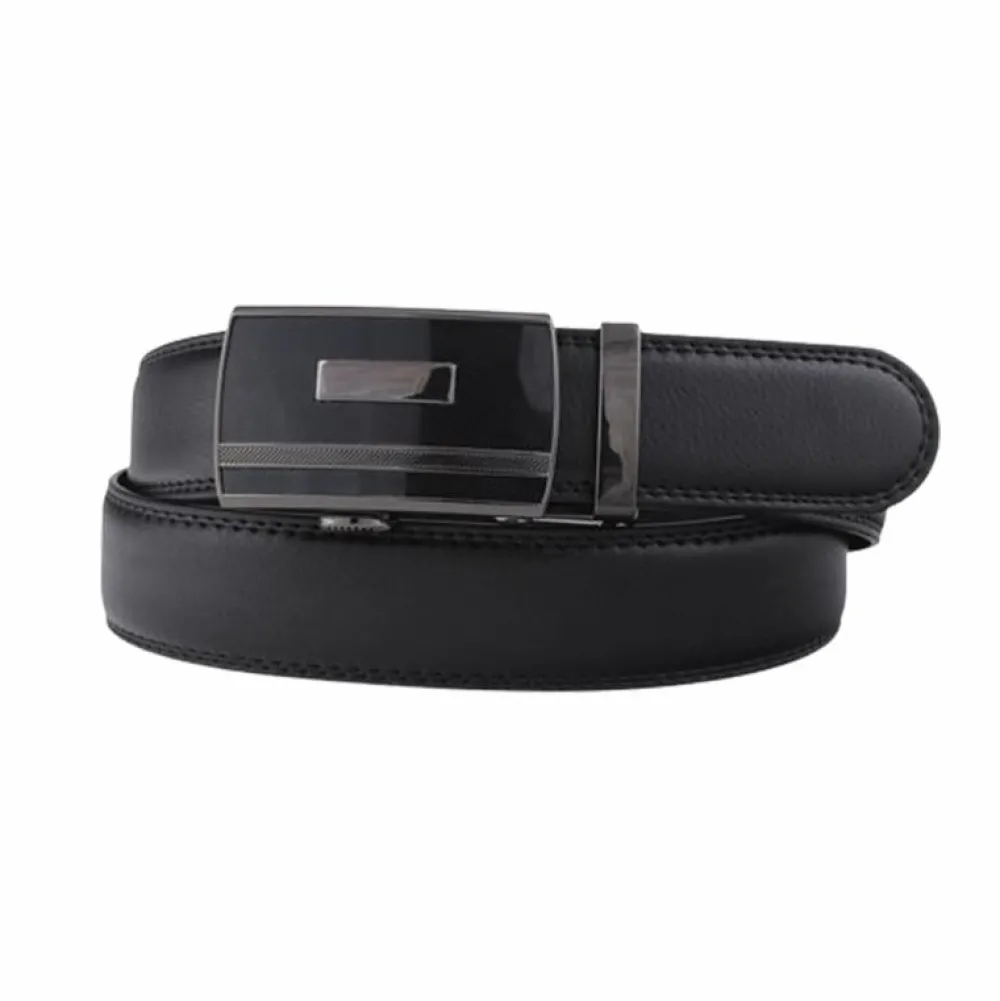 Unisex bælte med smart spændingsfunktion. Bæltet har en sort og metalfarvet spænde.