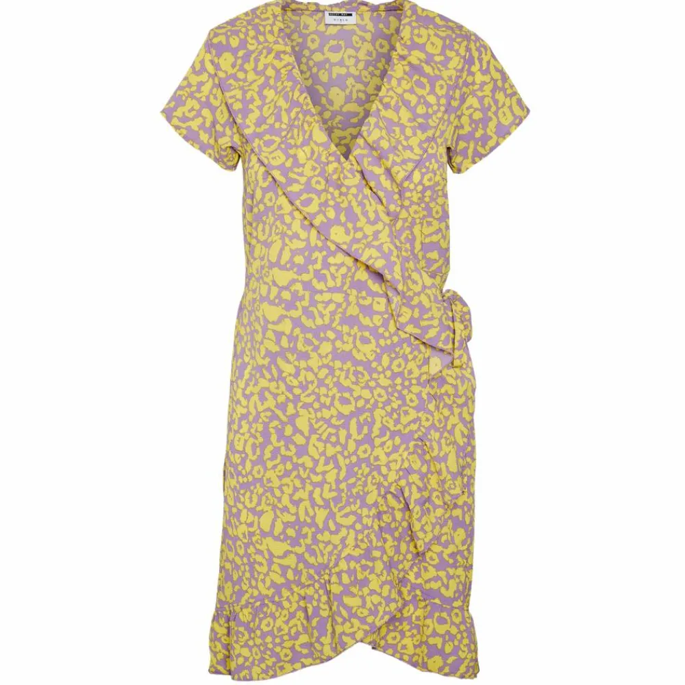 Noisy May dame Clara kjole. Flot kortærmet slå-om kjole i all-over leopardprint og med flæse detaljer. Kjolen har en smuk V-udskæring og lukkes med en trykknap og bindebånd i siden.