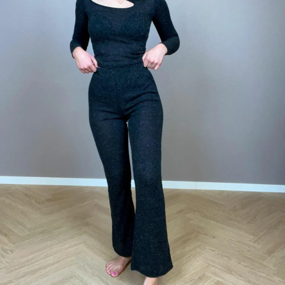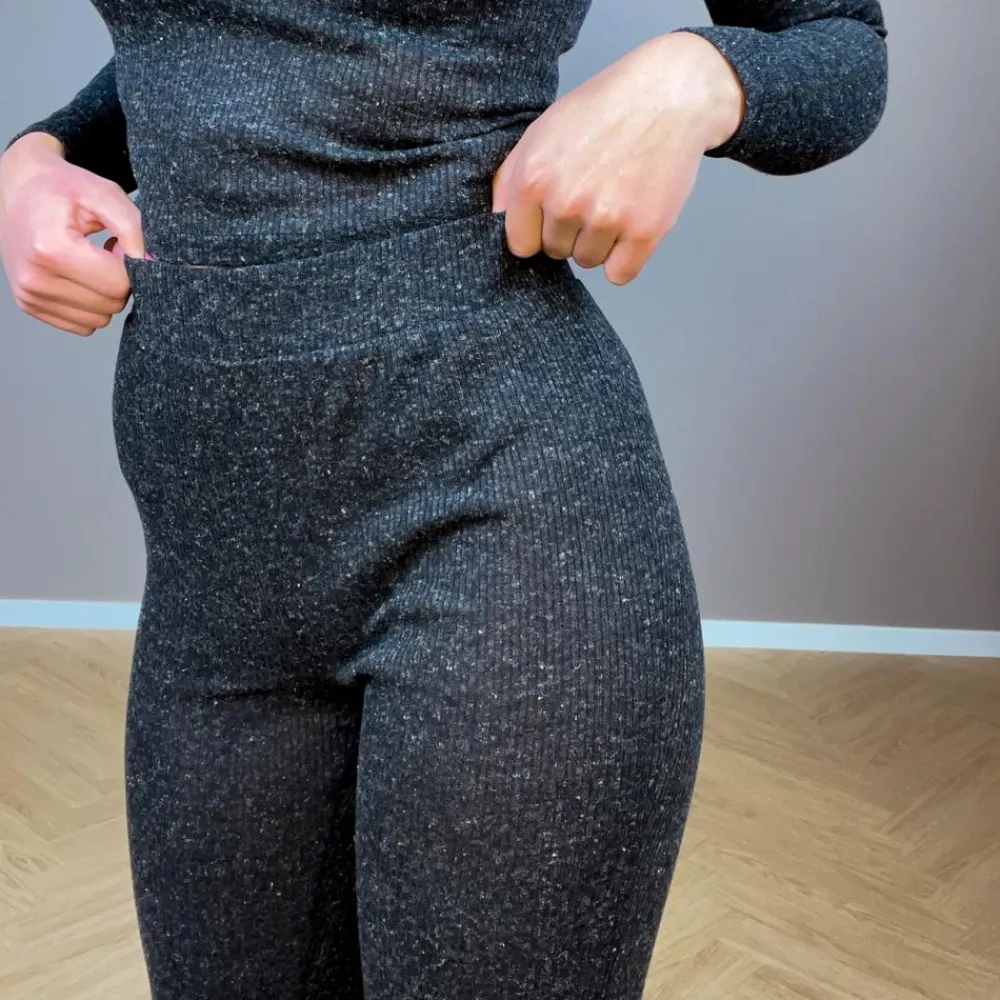 Noisy May dame bukser. Bukserne har ribstrikket mønster, samt er bukserne højtaljede. Bukserne har elastik i taljen, som gør at bukserne tilpasser sig om livet.