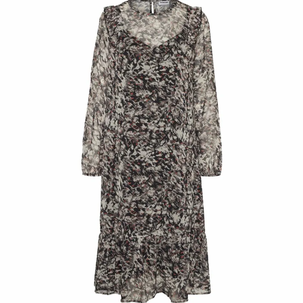Noisy May kjole. Fin lang kjole med abstrakt print og flæser ved skuldrene.