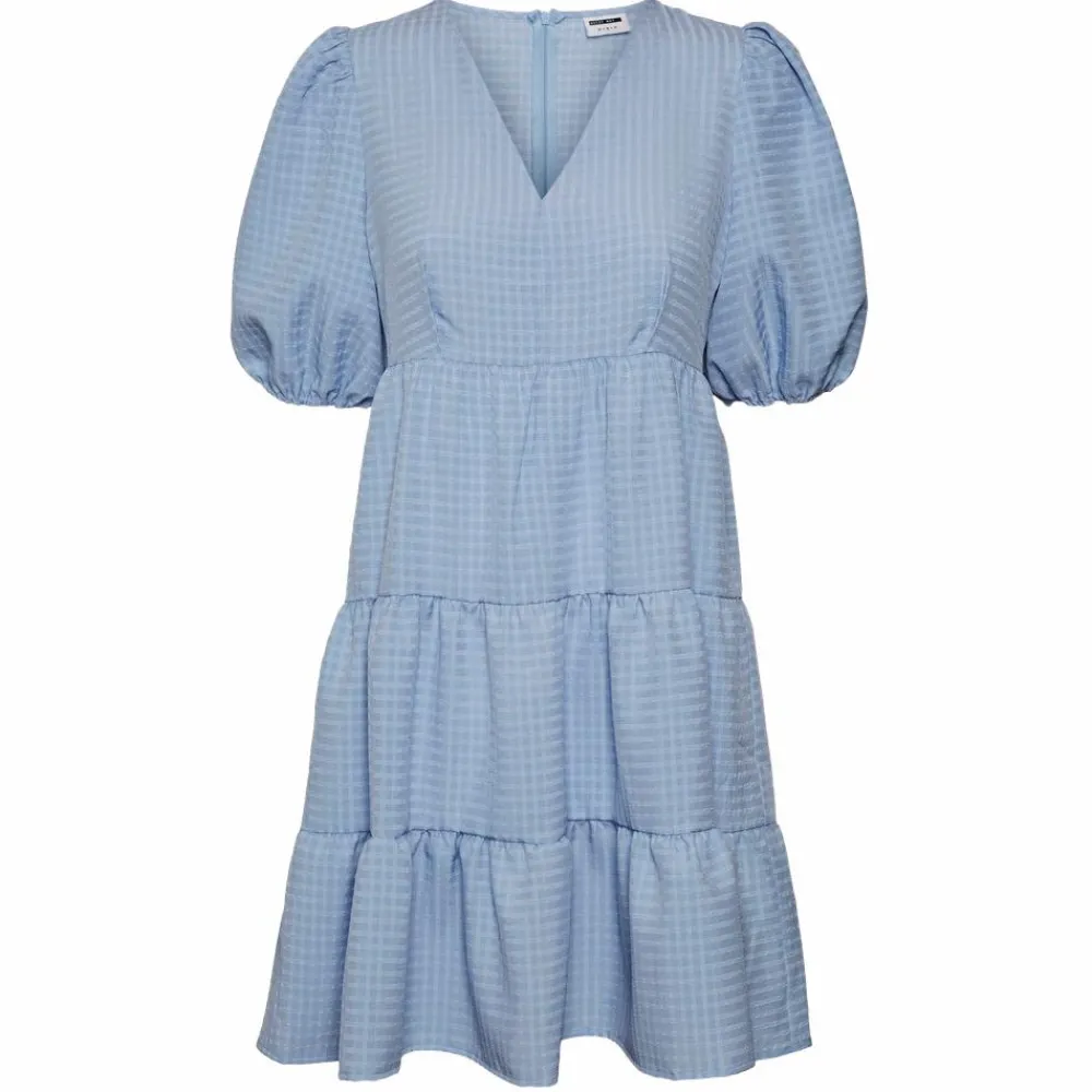 Noisy May Stacey dame kjole. Smuk kortærmet kjole med struktur i stoffet. Kjolen har V-udskæring, pufærmer med elastik samt skæringer, som giver en flot pasform. Kjolen lukkes i ryggen med en skjult lynlås.