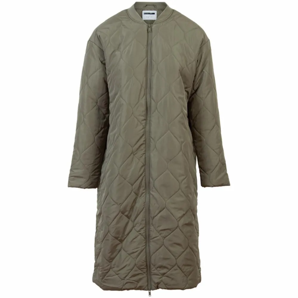 Noisy May lang dame jakke. Jakken er lang og har gennemgående lynlåslukning. Jakken har ribkant om halsen, samt gennemgående mønster. Jakken har en 2-vejs lynlås, som gør det muligt at åbne den nedefra. Jakken har 2 åbne sidelommer.