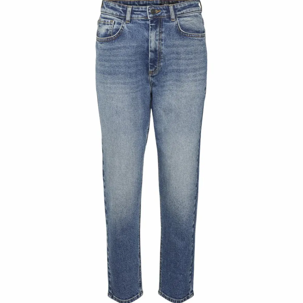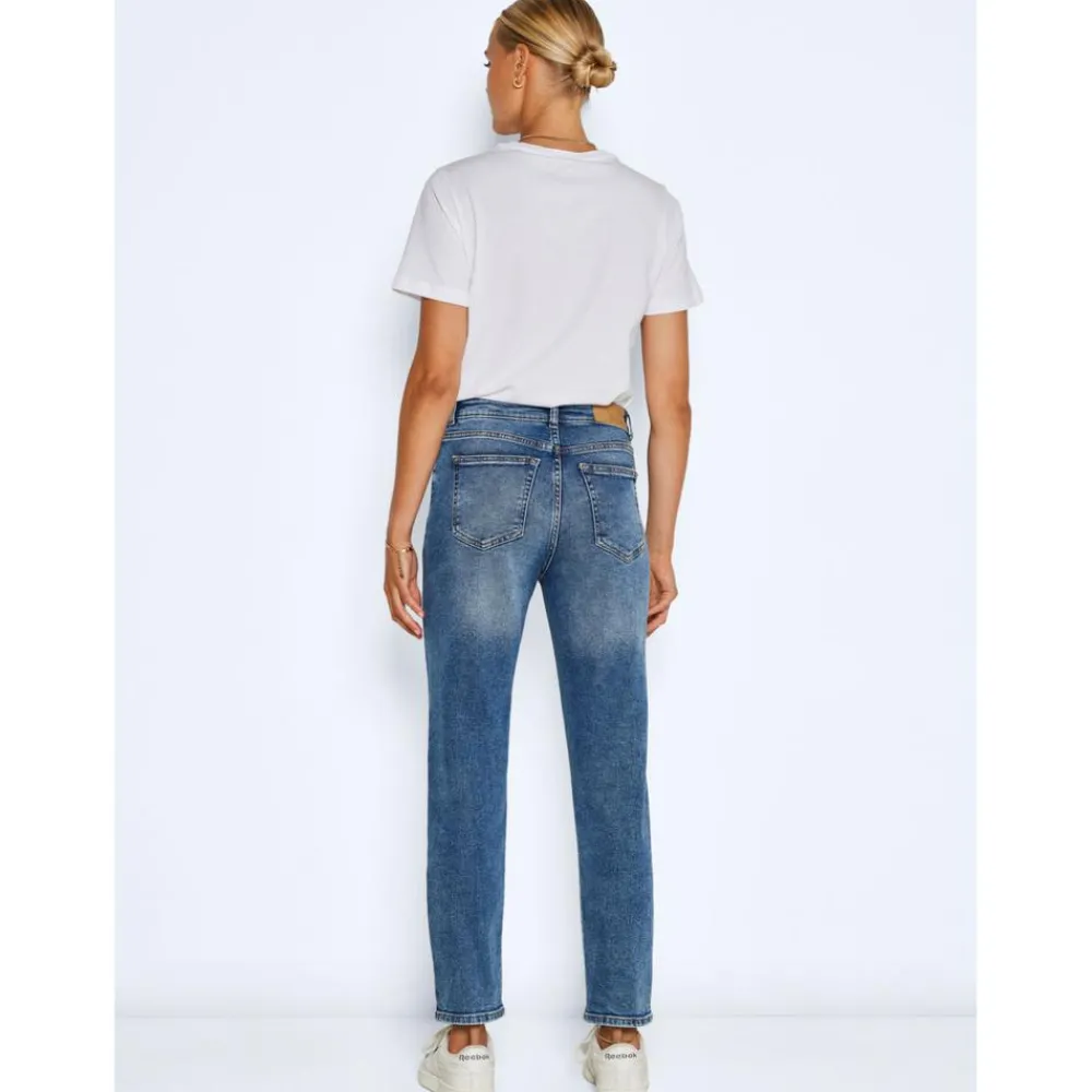 Noisy May dame jeans. Bukserne er højtaljede med ankellængde og lige ben. Der er lynlås og en enkelt knaplukning, samt bæltestropper, 3 lommer foran og 2 bagpå.