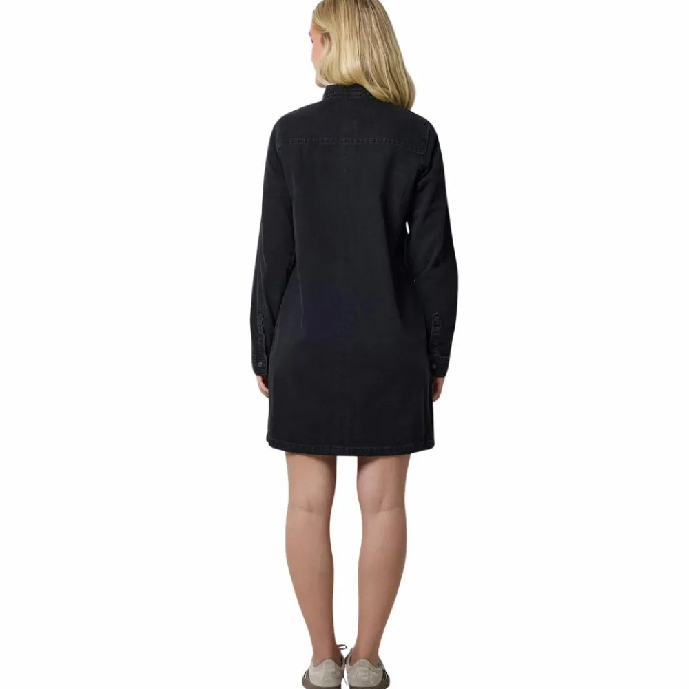 Langærmet denim kjole i midi-længde med gennemgående knaplukning. Kjolen har to lommer med flap.