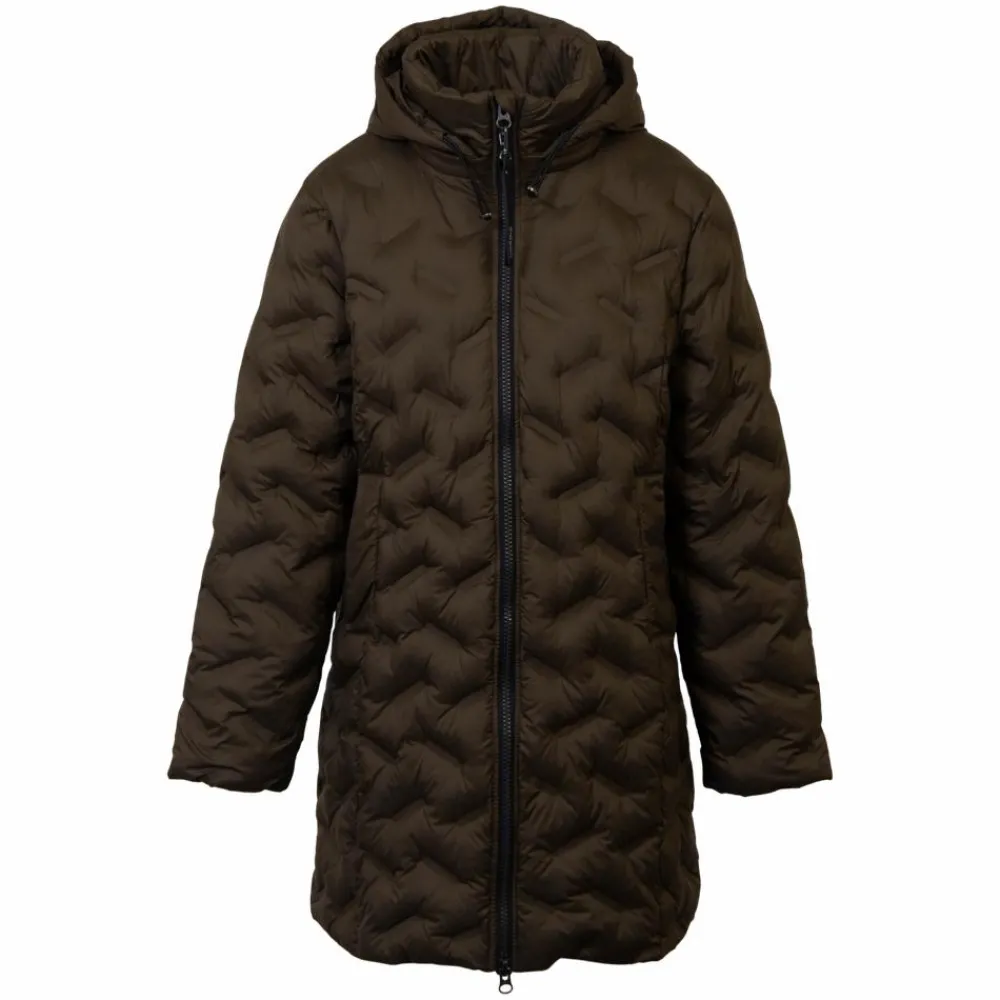 Lang vinterjakke med gennemgående lynluslukning, høj krave, to lommer med knaplukning samt justerbar hætte. Jakken er vandafvisende og vindtæt og har en særlig ekstra varme effekt.