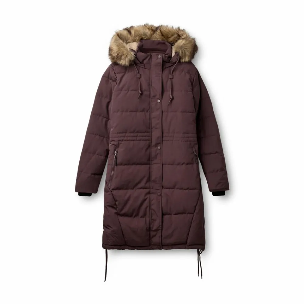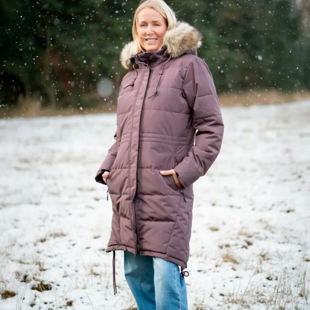 Lang dame vinterjakke med gennemgående knap- og lynlåslukning. Jakken har aftagelig hætte med aftagelig pels samt snøre. Jakken har to lommer med lynlås samt en lomme med lynlås indvendig. Det er muligt at snøre jakken ind i ryggen, så den får en flot pasform og i bunden af jakken. Jakken har varmt plys for indvendig i den øverste del og gemt ribkant i ærmegabet.