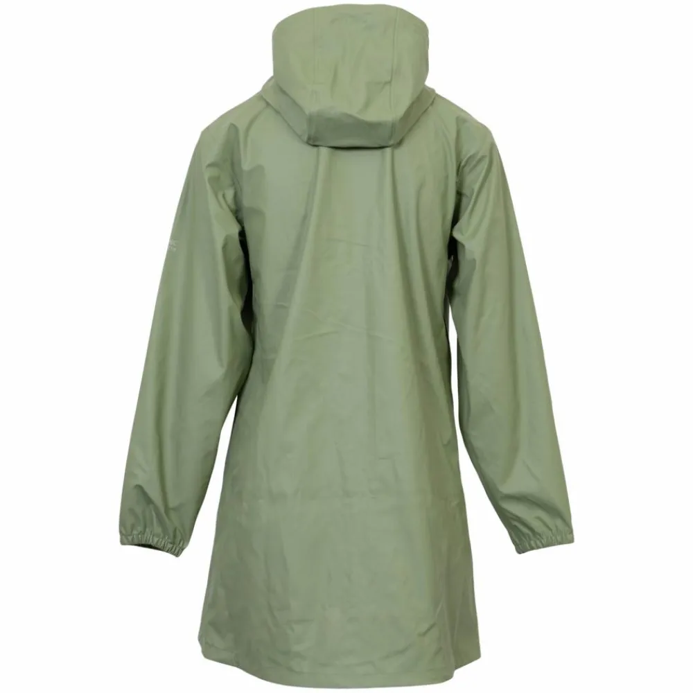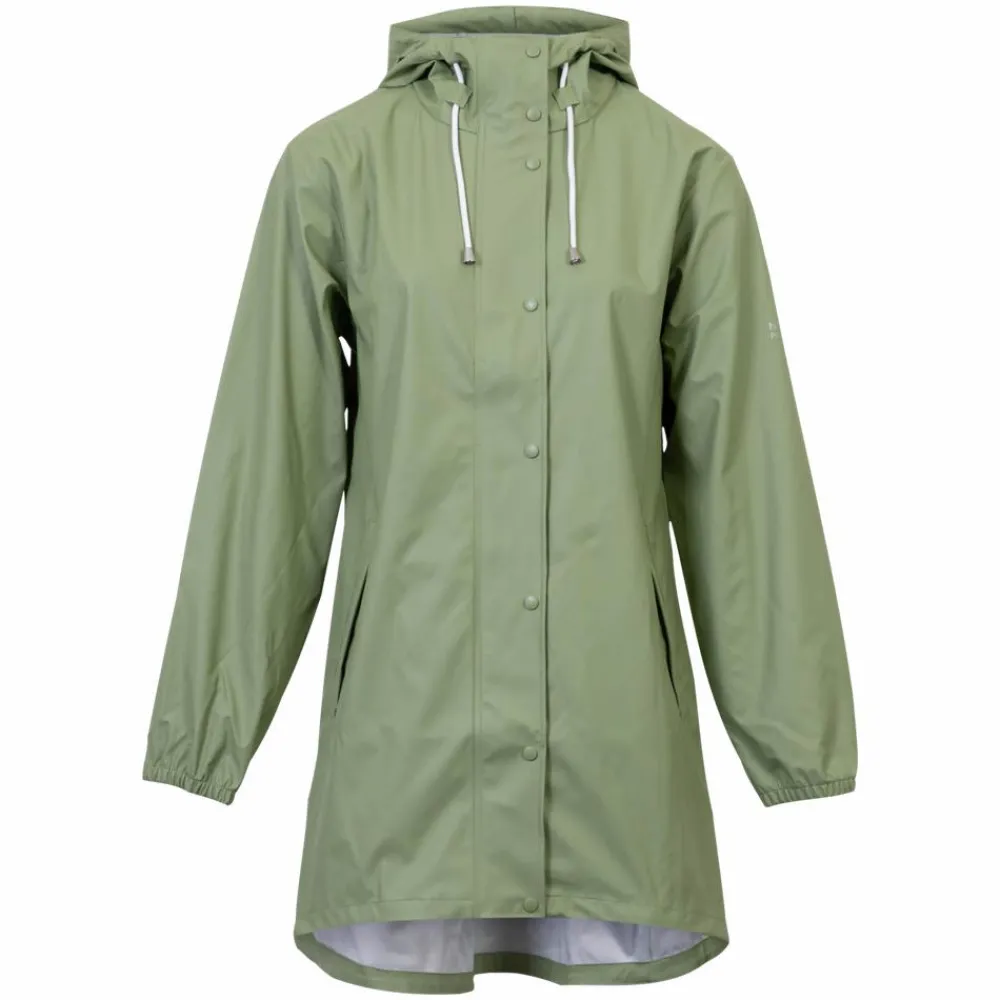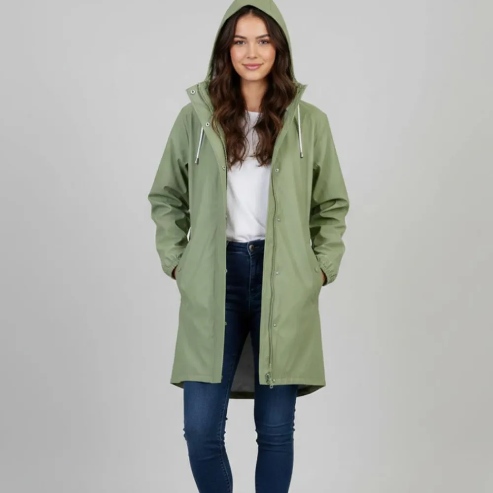 Hold dig tør på de våde dage med en let og praktisk jakke i mistletoe-grøn. Den rene silhuet går til midt på låret, så du får god dækning uden at miste bevægelsesfriheden. En rummelig hætte med justerbare snører og solide trykknapper foran lukker tæt, når vinden tager til.