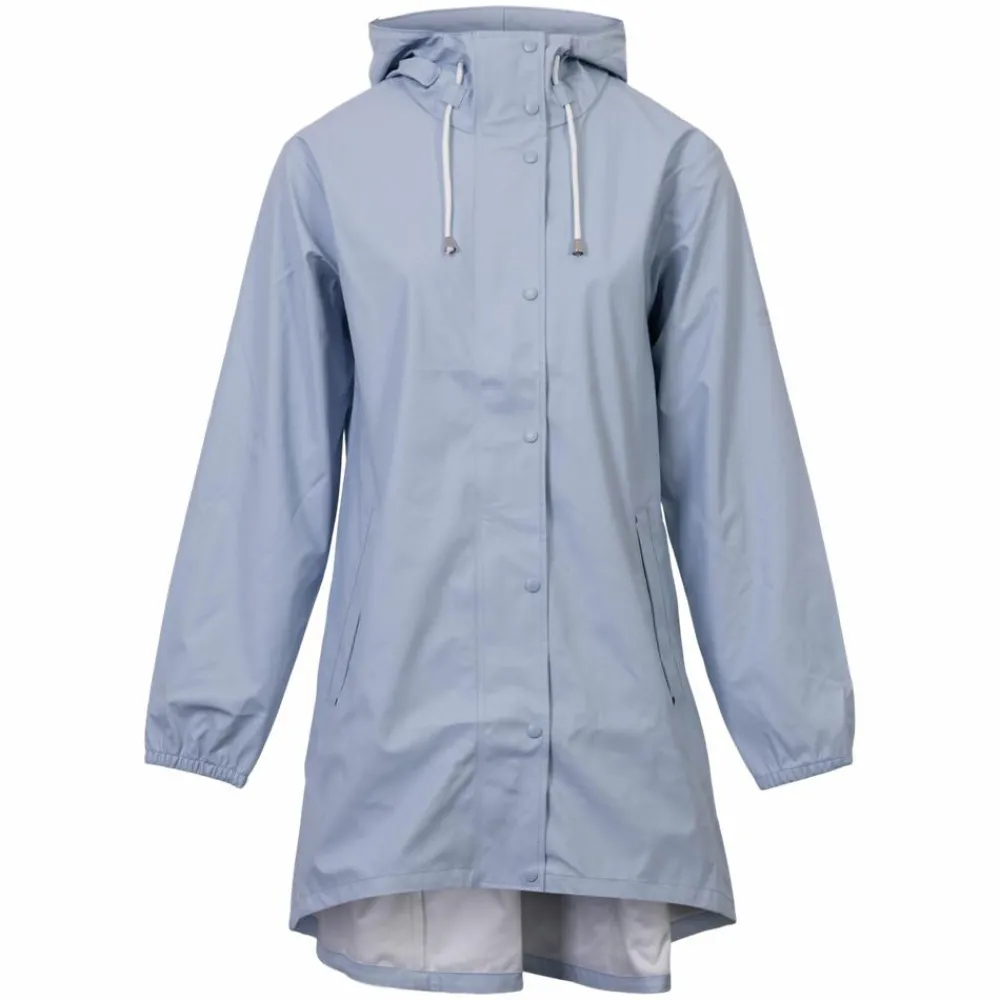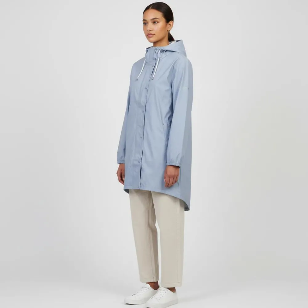 Denne jakke i en blid lyseblå tone giver tør komfort på vej til arbejde, i byen eller på stien. Den lette a-form og den lidt længere bagside skaber fri bevægelse og ekstra dækning, mens det enkle udtryk passer til både jeans og kjoler. Se også vores regntøj for flere muligheder.