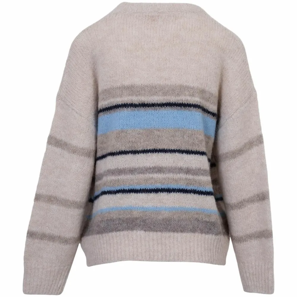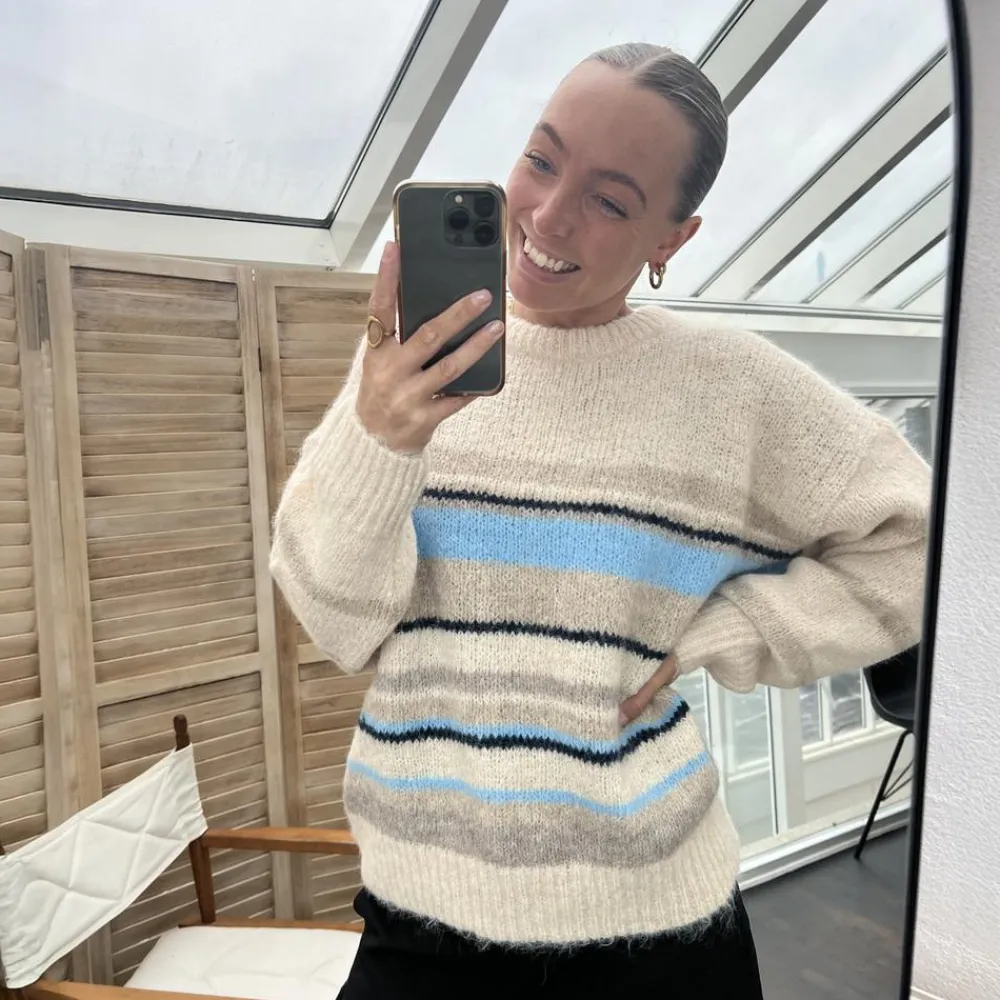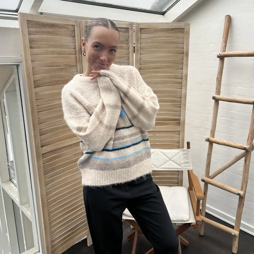 Denne striktrøje rammer balancen mellem afslappet og pæn. Den lyse beige tone med blå og grå striber giver et roligt look, der passer til alt fra hverdag på farten til stille stunder hjemme. Style den med jeans for et klassisk sæt, eller find flere muligheder i strik og cardigans.