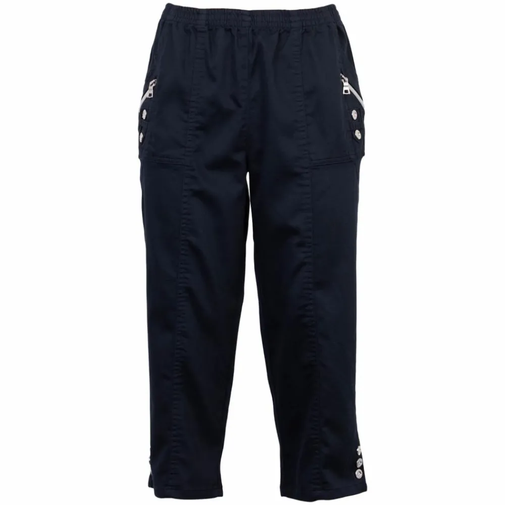 pure instinct capribuks til dame. Bukserne har elastik i taljen og to lommer med lynlås detalje. Denne fine buks er fyldt med andre fine detaljer som sølv knapper og syninger forskellige steder på fronten.