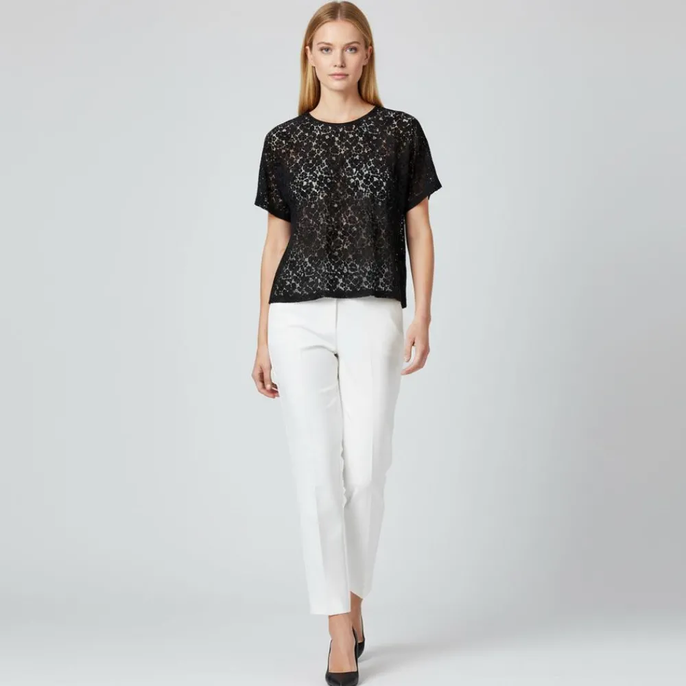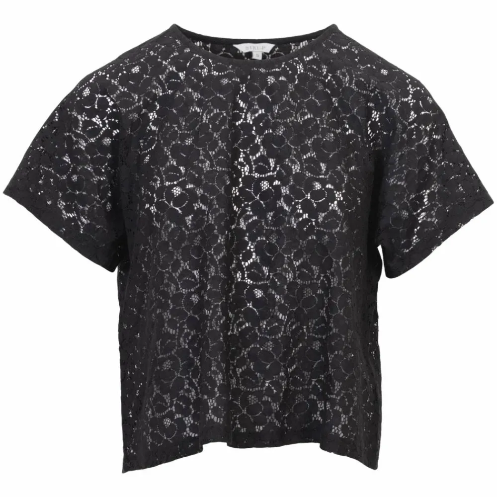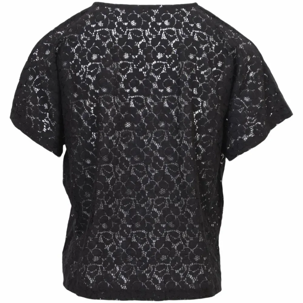 Sort blondeoverdel med korte ærmer og rund hals, der falder let og giver et roligt udtryk. Den gennemsigtige struktur indrammer kroppen på en diskret måde, så lag på lag føles naturligt over en top. Snittet er let afslappet, og længden rammer ved hoften for et flatterende fald.