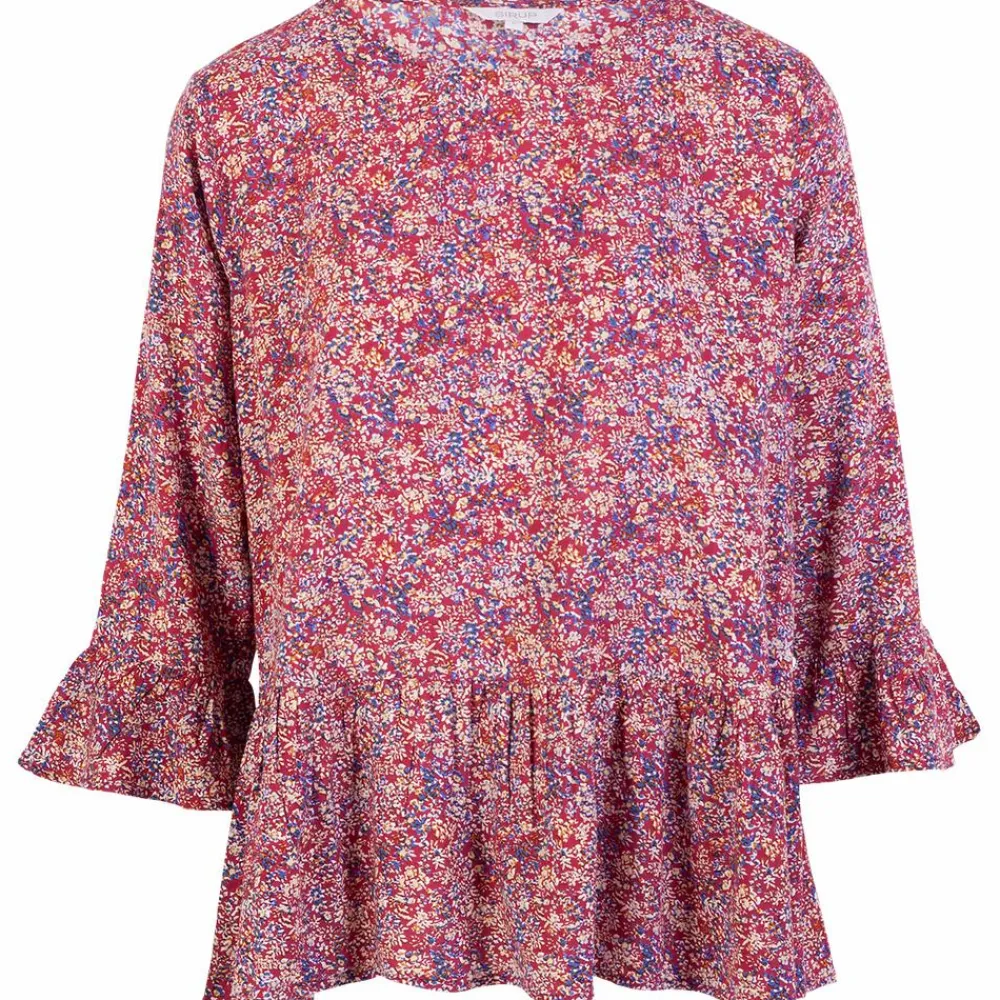 Sirup dame bluse. Feminin viskose bluse i smukt blomsterprint. Blusen har trekvart ærmer med fin flæse detalje, rund halsudskæring, samt skæring som giver en flot og feminin pasform.