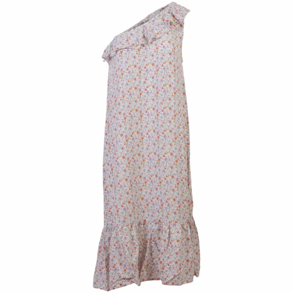 Sirup One-shoulder dame kjole. Kjolen har all-over blomster motiv, samt en skæring på tværs og flæser i toppen. Kjolen er stroplås og har elastik i toppen, som gør at kjolen tilpasser sig