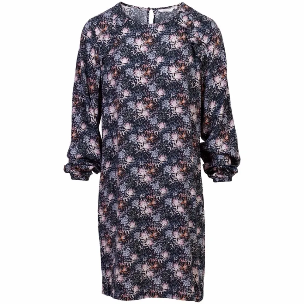 Sirup dame kjole. Kjolen har all-over print, samt har den rund halsudskæring med en knappelukning i nakken. Kjolen har elastik i ærmet, som gør at den tilpasser sig til armen. Blusen har flæser ved skulderne.