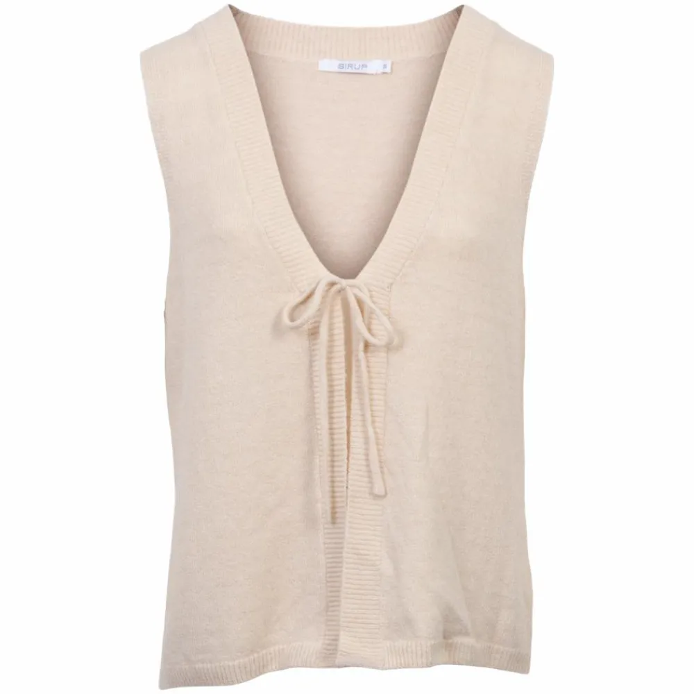 Sirup dame strikvest i ensfarvet beige. Vesten har en v-hals og bindelukning på fronten.