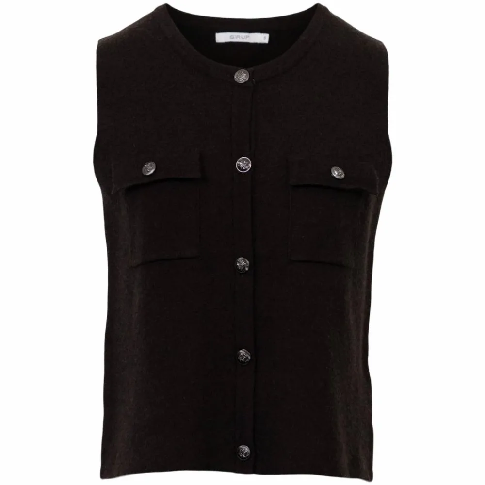 Elegant strikvest fra Sirup i en flot mørkebrun farve. Vesten har rund hals, dekorative sølvknapper og to brystlommer. En klassisk og alsidig strik, der med sin lige pasform er let at style over både skjorter, kjoler og t-shirts.