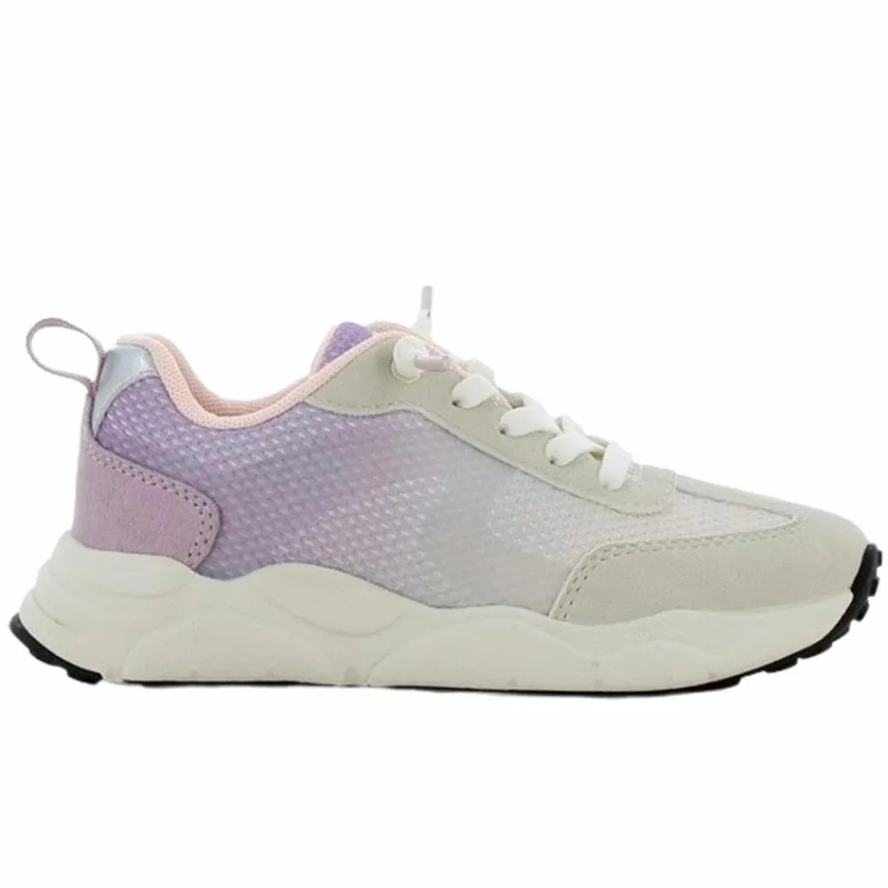 Denne pige-sneaker i lilla/sølv blander blid glans med et frisk, moderne look. Den bølgede sål føles behagelig hele dagen, mens den polstrede kant om anklen giver en tryg pasform. Farvespillet går fra lys lilla til sølv og giver et fint twist til både jeans og kjoler. Se også vores sko og find bløde stromper-og-strompebukser til outfittet.