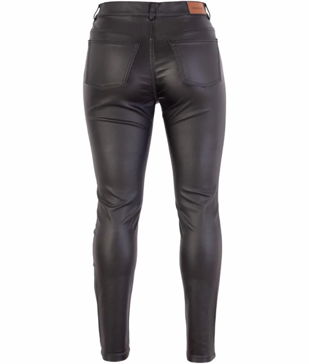 Steenholt Costabrava coated plus size dame jeggings. Trendy coated jeggings med masser af stretch og to baglommer. Bukserne har bæltestropper i linningen samt lynlås- og knaplukning.