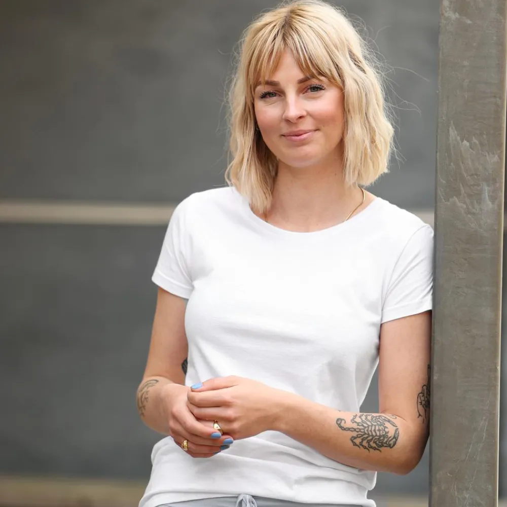 Materialet i 95% bomuld og 5% elastan føles blødt mod huden og giver behagelig stræk, så formen holdes uden at stramme. Brug den til hverdag med jeans eller som base under jakker og cardigans.