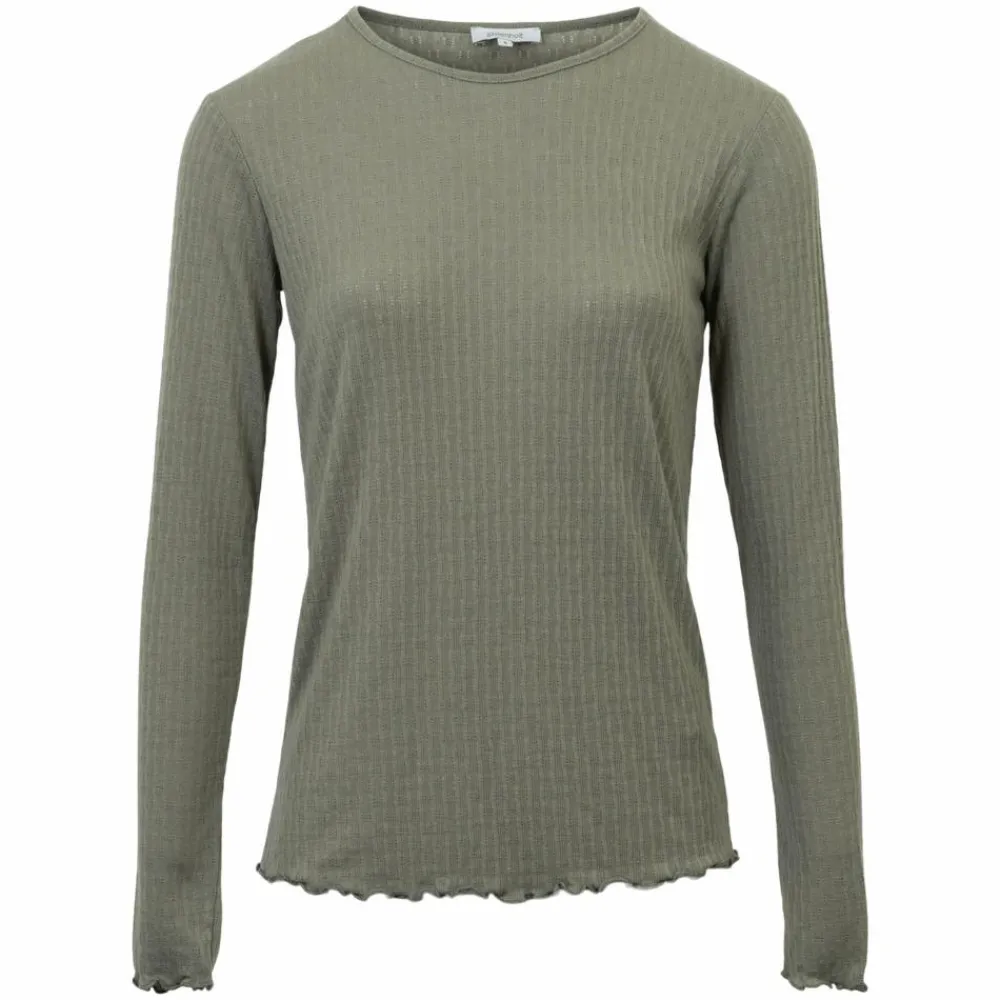 En ribbet bluse med hulmønster, i en blød, grøn nuance, der sidder tæt uden at klemme. Rund hals og lange ærmer giver et rent udtryk, mens de fine bølgekanter ved ærmer og søm tilfører et feminint strejf. Brug den alene eller som lag under en blazer for et enkelt, pænt look.