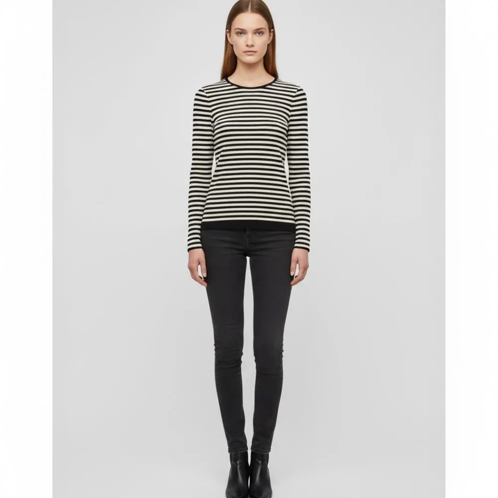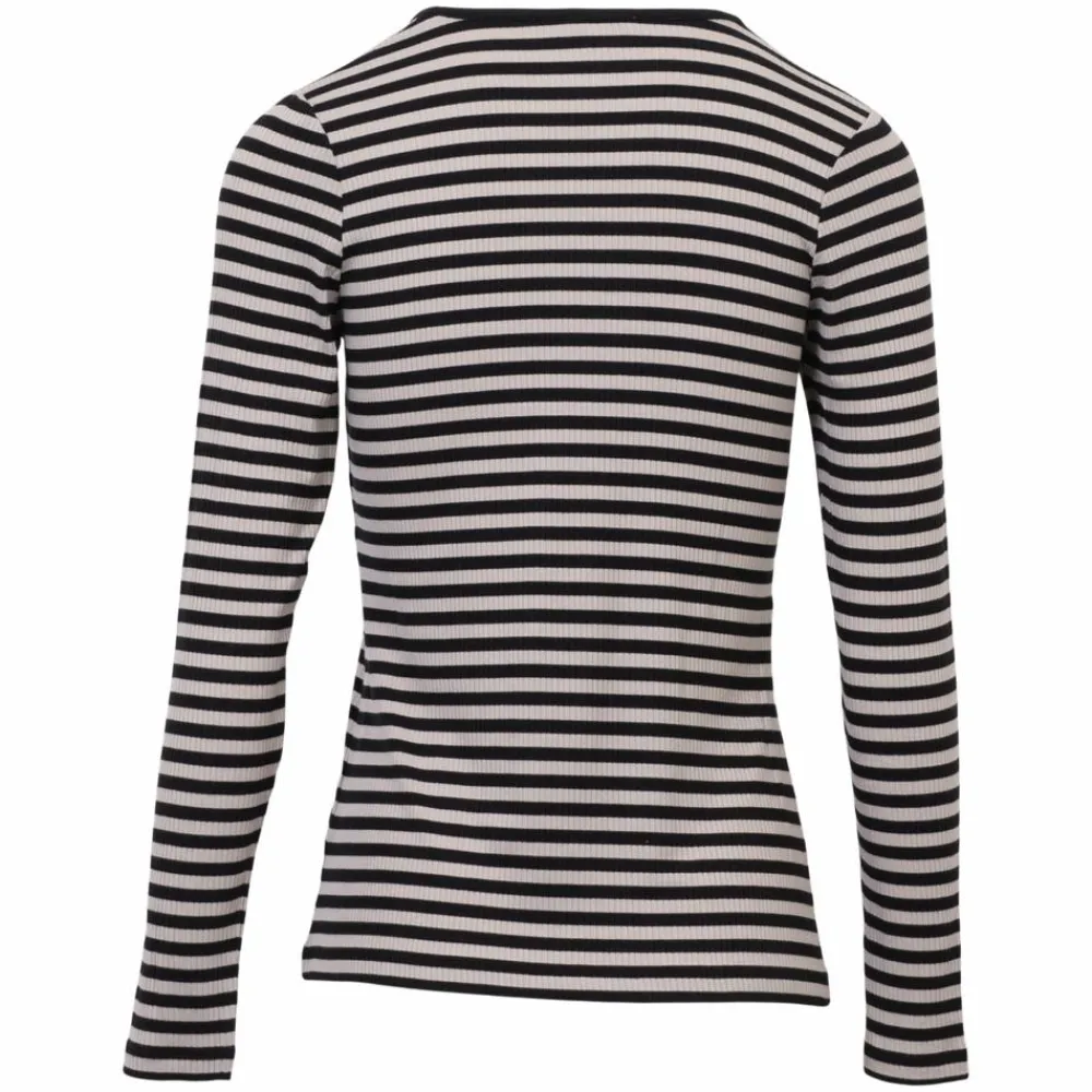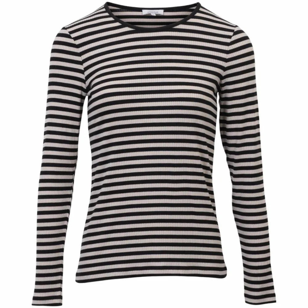 Langærmet dame t-shirt i klassiske sorte og lyse striber. Slank pasform og rund hals med diskret kant gør den let at style til hverdag og arbejde. Stoffet falder pænt og føles blødt mod huden.